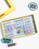 Make waves with your mani. The Mermaid Press-On Nail Kit is packed with under-the-sea style, featuring ocean-inspired nail designs, sparkly gem nail stickers in mermaid-approved shades of pink, purple, green, and white, and a shell-shaped adjustable ring to complete the look. With pre-applied adhesive and a reusable design, these nails are as easy to wear as they are to love—no glue, no mess, just sea-sational sparkle.