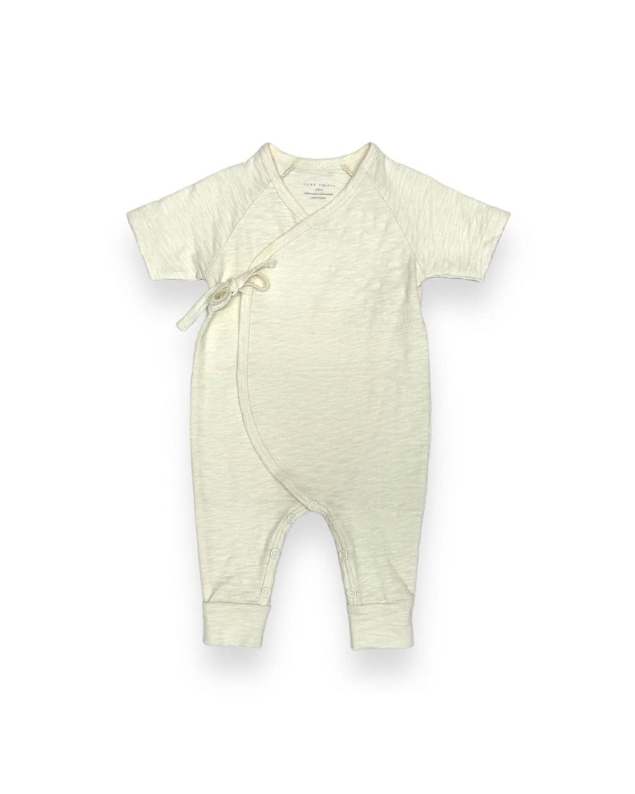 Using the lightweight and breezy flamé knit, the timeless kimono coverall returns to the collection in short sleeves for the warmer season. This iconic silhouette has double front ties and extra length for full pants coverage. The easy ties and front snaps make it a favorite for all new parents.