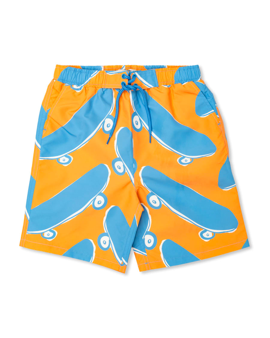 Introducing the Stella McCartney Kids Swim Shorts, an epitome of playful elegance for young adventurers. These boys' swim shorts, crafted from lightweight, quick-drying polyester, boast a vibrant and dynamic design featuring blue skateboards on a bold orange backdrop. The simple cut, characteristic of classic swimwear, is designed to provide comfort and ease of movement.