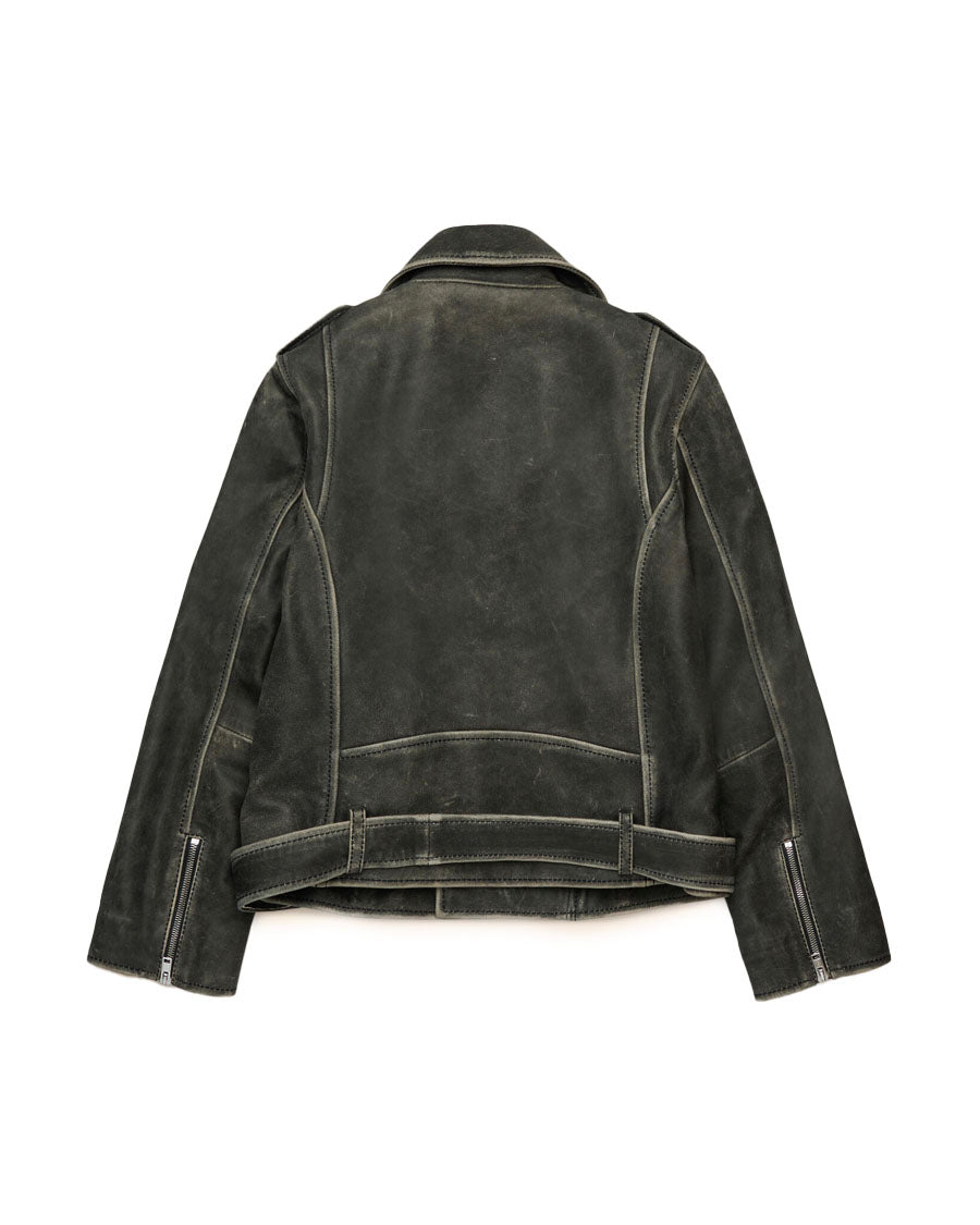 Biker jacket made from genuine leather with a worn-in look, featuring a lapel collar and off-centre zip. Zip pocket, zip cuffs and buckled belt at the hem. Chunky hand-stitched Marni Symbol on the shoulder.