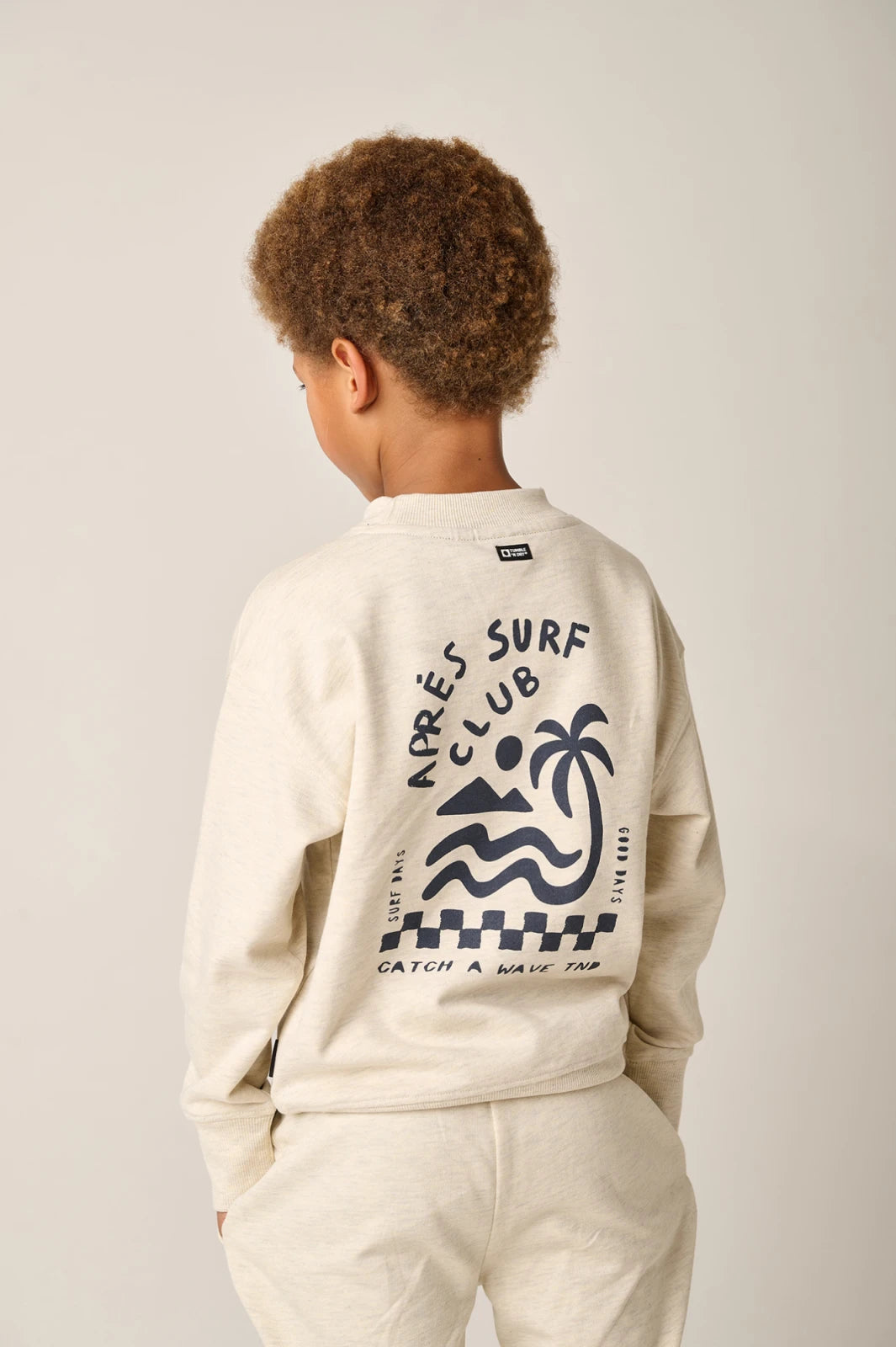 This boys' sweater in an off-white hue combines comfort with a cool design. The back features a striking graphic print with a wave and surf motif, while a small matching patch on the chest adds a playful touch. Made from 100% organic cotton in a soft, brushed French terry. The regular fit and ribbed cuffs ensure a comfortable fit and make this sweater perfect for everyday wear.