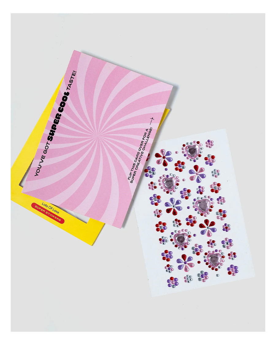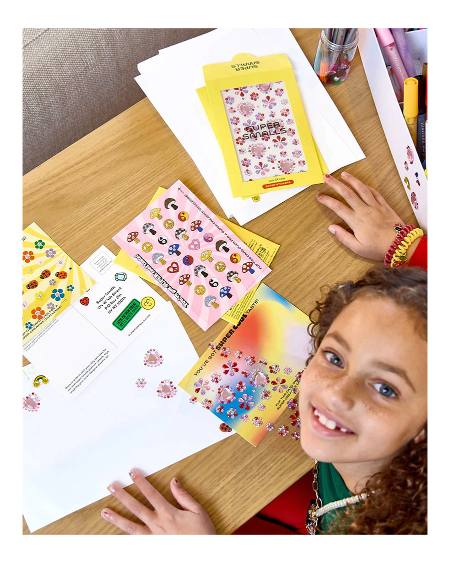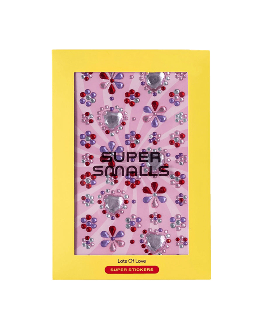 Say "I Love You!" With Stickers. Our Lots of Love Super Sticker Sheet features gem hearts and flowers in pretty pinks and purples. Whether you’re making a card for Mom or decorating your school notebooks, these sparkly stickers will show off your SUPER big heart. Plus, each sheet comes with its own postcard—a place for you to draw new ideas or write your biggest wishes for Super Smalls. Mail it back to us and you just might see your creations come to life!