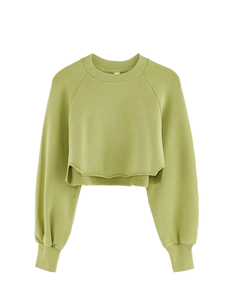 Relaxed sweatshirt with a crewneck, long sleeves and a cropped waist with notched details, made from smooth fleece in khaki green.