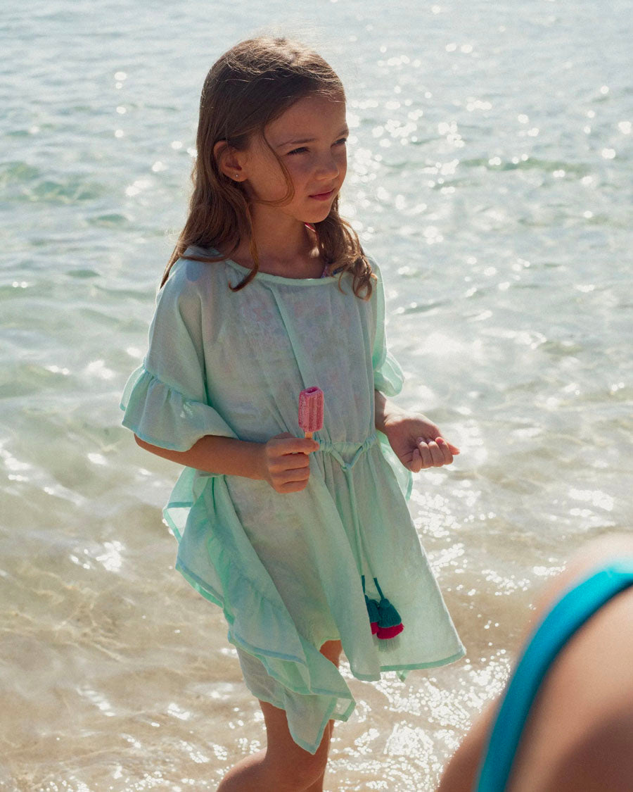 Discover the beautiful Lea cover-up in its new aqua shade, perfect for your sunny beach getaways. Its delicate ruffled sleeves and exclusive cords, adorned with multicolored handmade tassels, add a touch of elegance and freshness to your look. Made from 100% cotton crepe, it guarantees exceptional softness and lightness.