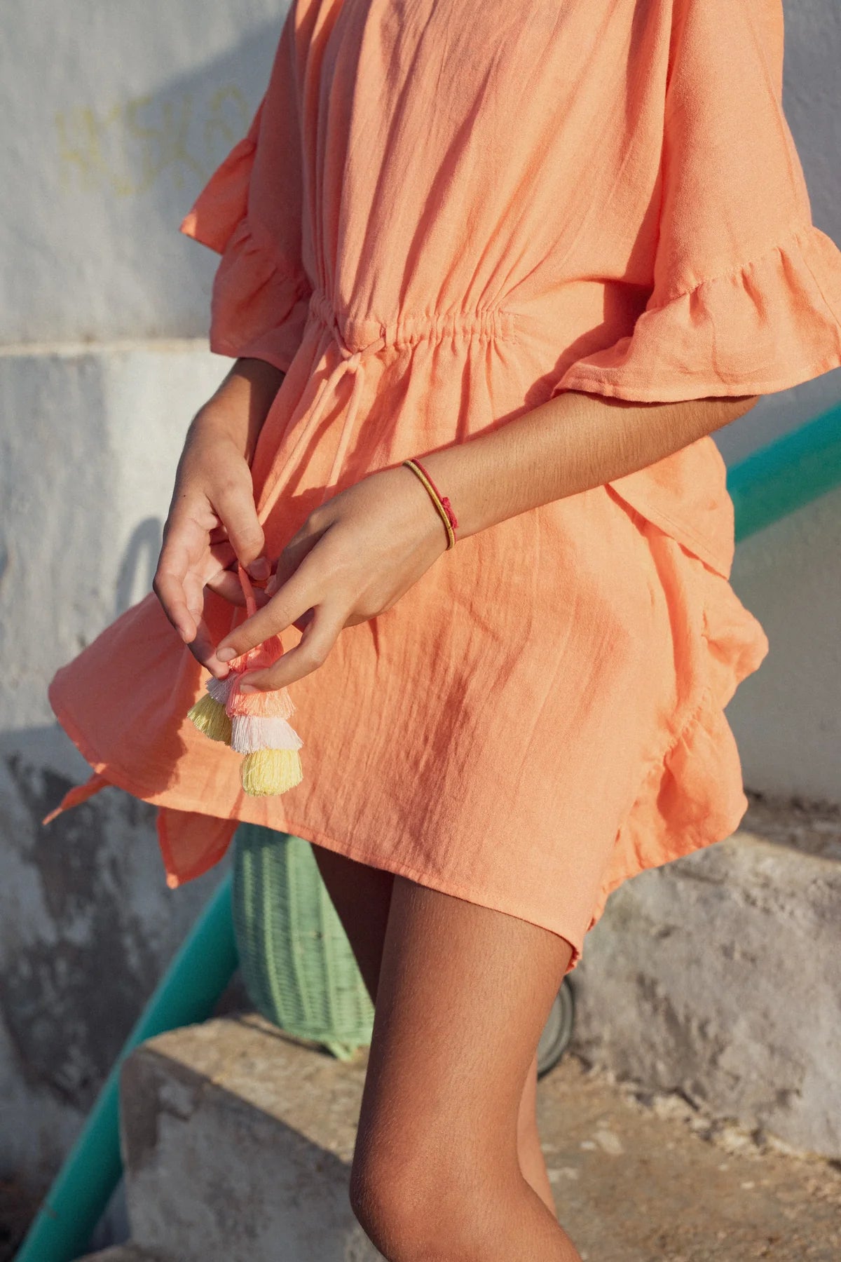Discover the superb Lea coverup, ideal for your sunny days at the beach. With its elegant ruffled sleeves and cords decorated with multi colored tassels, this model combines style and comfort. Made from 100% cotton crepe, it offers incomparable softness and lightness. Available in several colors, this timeless best-seller seduces many young girls every year. Practical and refined, the Lea caftan by Lison Paris slips easily into a suitcase and can be worn both in the city and by the water.