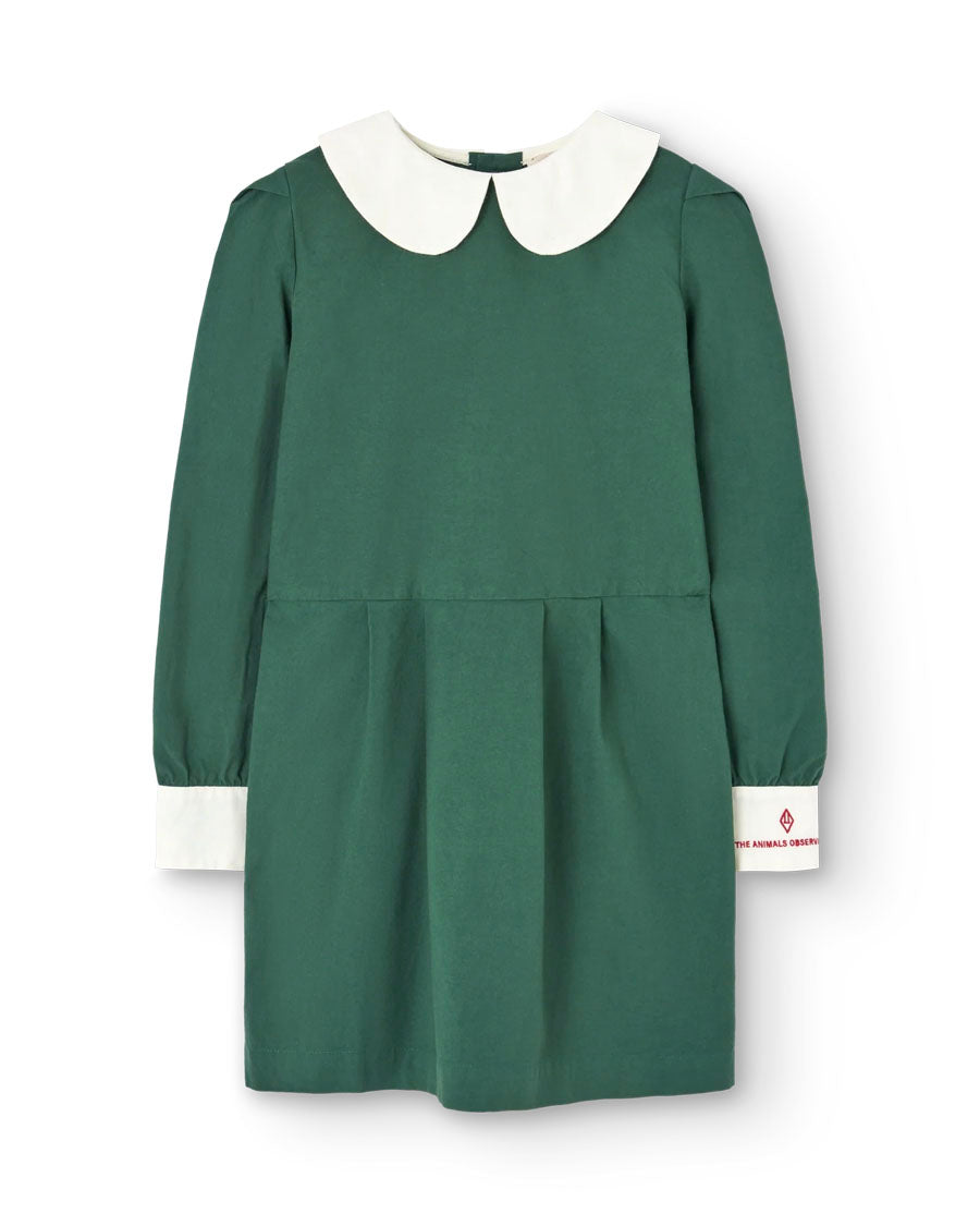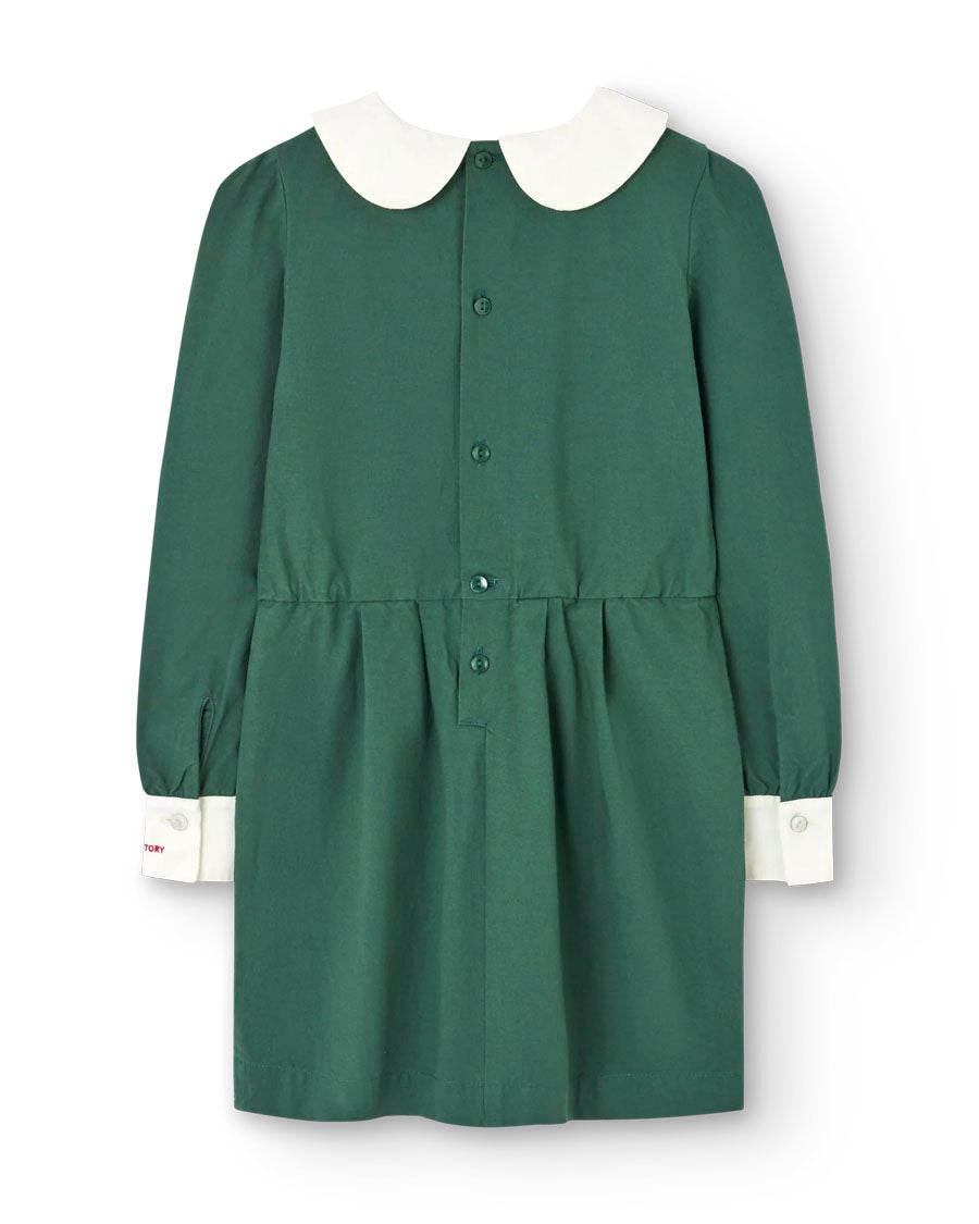 A timeless green dress with a bold white collar and elegant back buttons. Refined charm in clothes for kids.