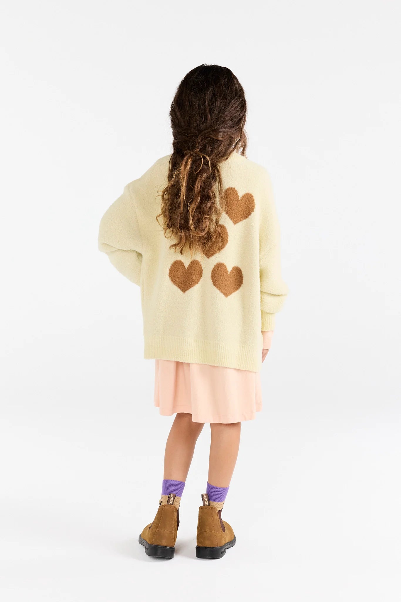 A sweet cream cardigan with heart details, designed for those who love statement kids clothing with soul.