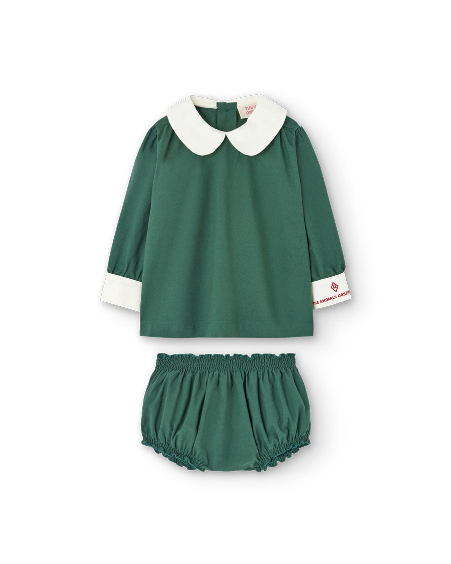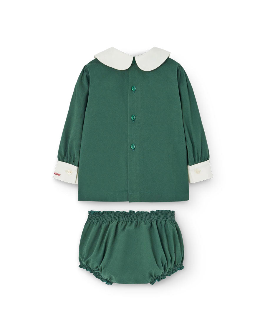 Elegant and playful, this green ensemble with contrast details defines classic kids clothing with a modern twist.