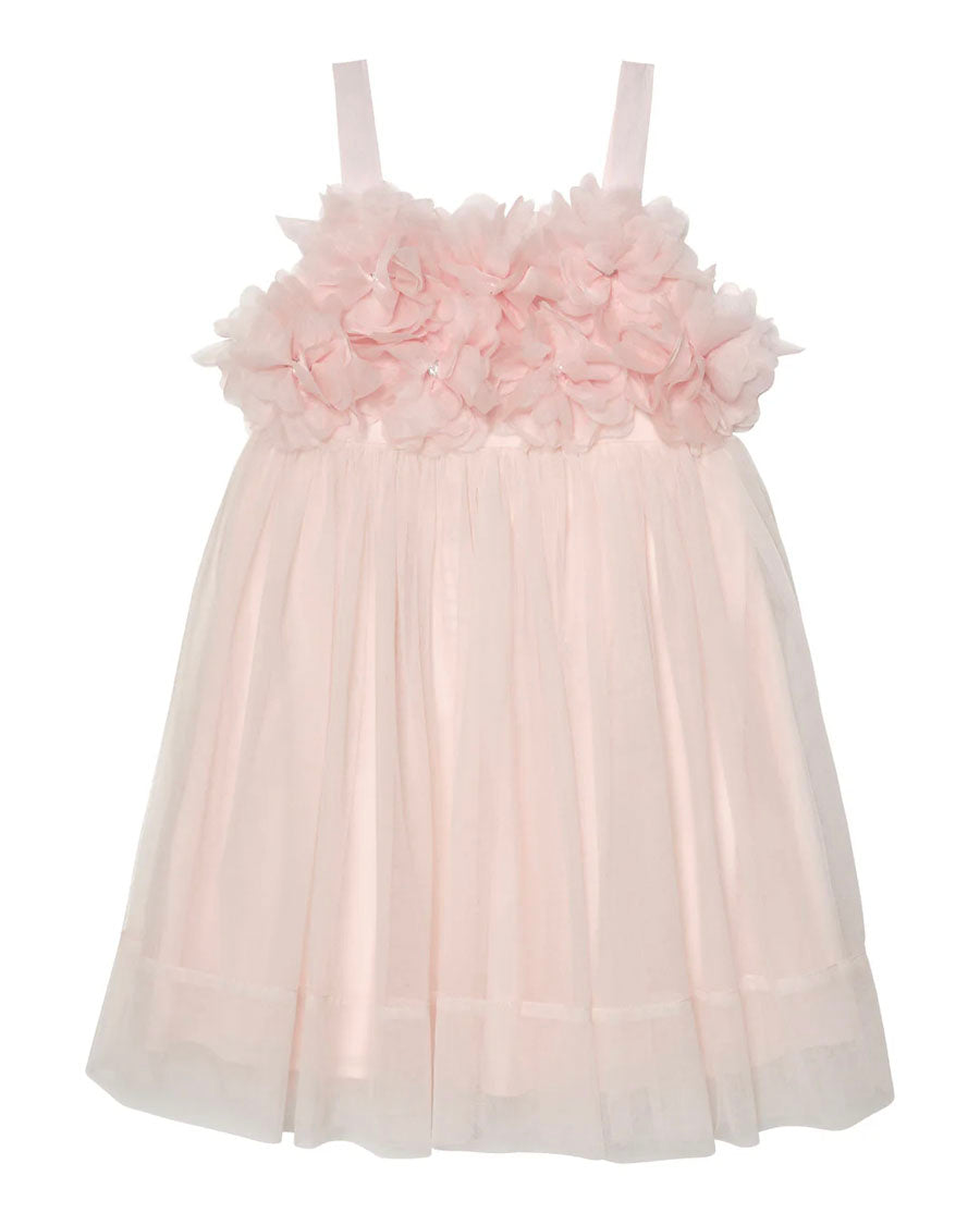 Unveil a world of floral enchantment with our Peony Tulle Dress in Heavenly Pink. This charming dress features a classic full tulle skirt with playful hem detailing that creates a beautiful, floaty effect—perfect for twirling like a lovely flower in full bloom. The bodice bursts with flowers, each crafted from soft organza and feature a sparkling crystal at the center, lending a flair of glamour that catches the eye.