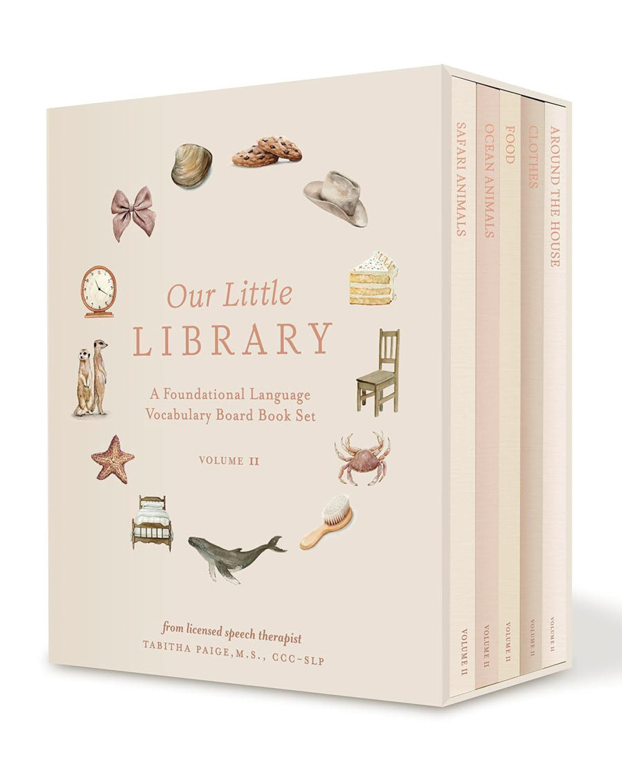 Our Little Library Vol. 2 includes five board books that feature foundational words in the following categories: