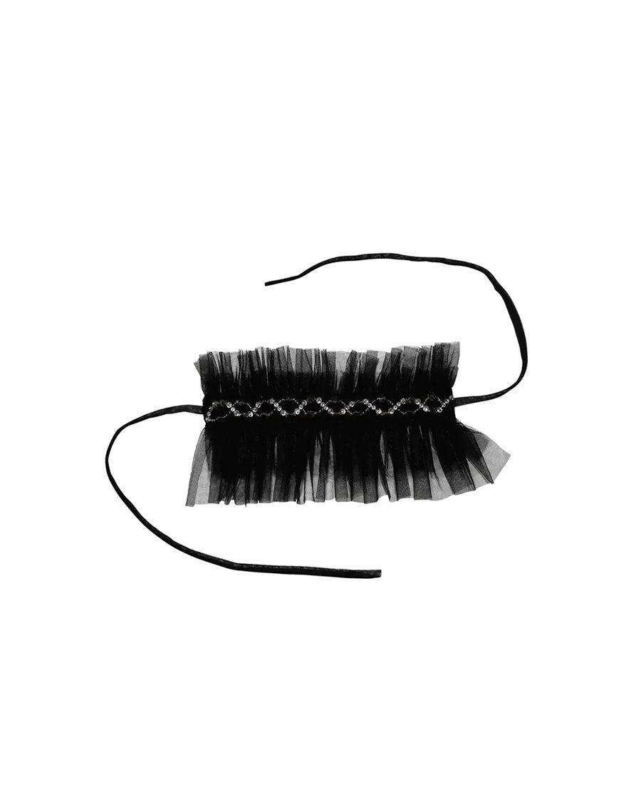 Add a touch of drama to your outfit with the Deadly Thorn Choker in Black. This stunning addition features a clutch of dazzling mini spiderwebs, studded into the lavish tulle ruffles. A band with an adjustable ribbon tie is used to secure this one-of-a-kind accessory. The perfect spooky addition to any Halloween costume. Made by Tutu du Monde.