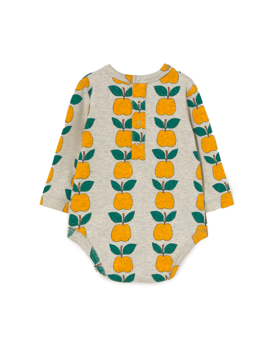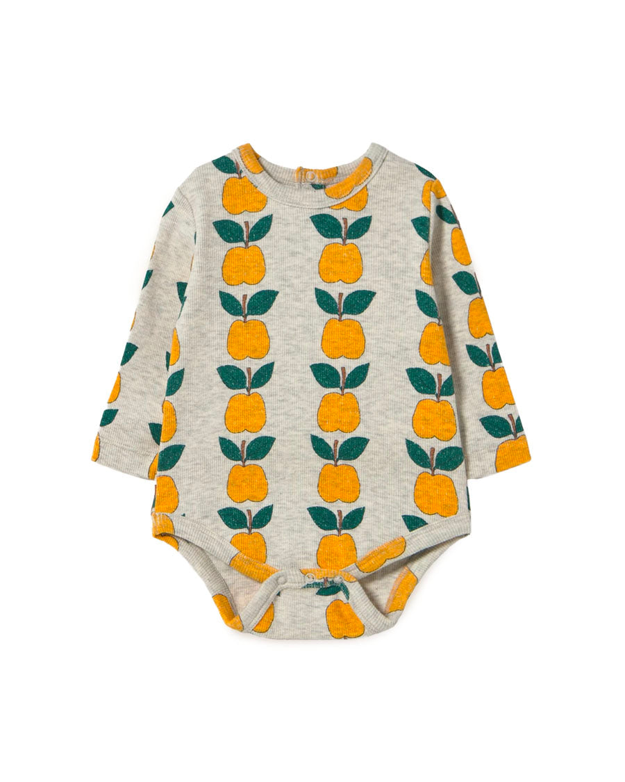 This colorful Apples printed rib body is crafted from a soft cotton blend, offering a breathable feel. It features a comfortable, relaxed silhouette with long sleeves and a snap opening at the bottom.