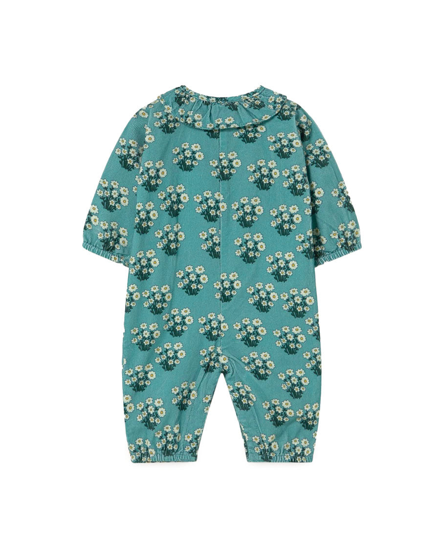 Made from soft 100% cotton corduroy fabric, this one-piece features a simple, relaxed silhouette with practical snap button openings at the bottom for quick changes. It also has a round neckline with delicate ruffles, elasticated hems, and a button opening for easy dressing. The classic White Bouquet print adds a subtle playful touch, while the comfortable fit makes it ideal for all-day wear.