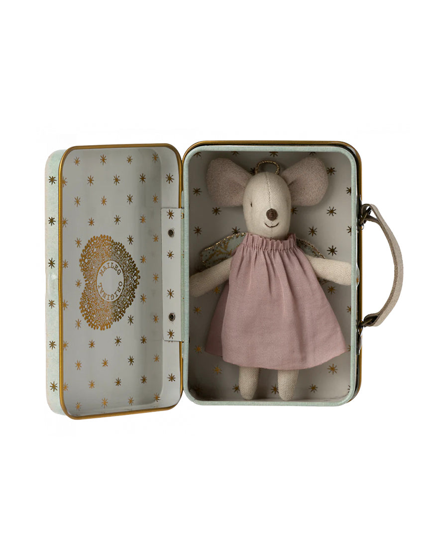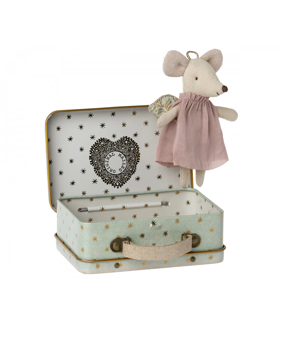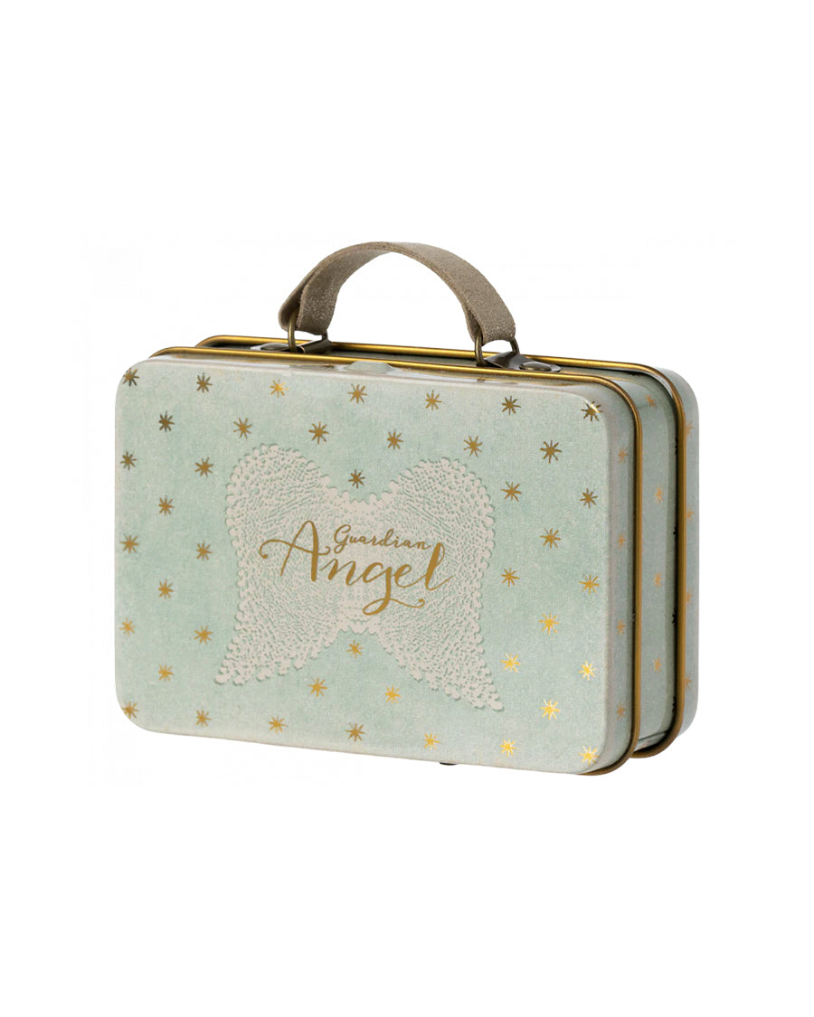 Guardian angels do their best to protect and watch over the little ones. This guardian angel comes in a mint colored metal suitcase. Made by Maileg.