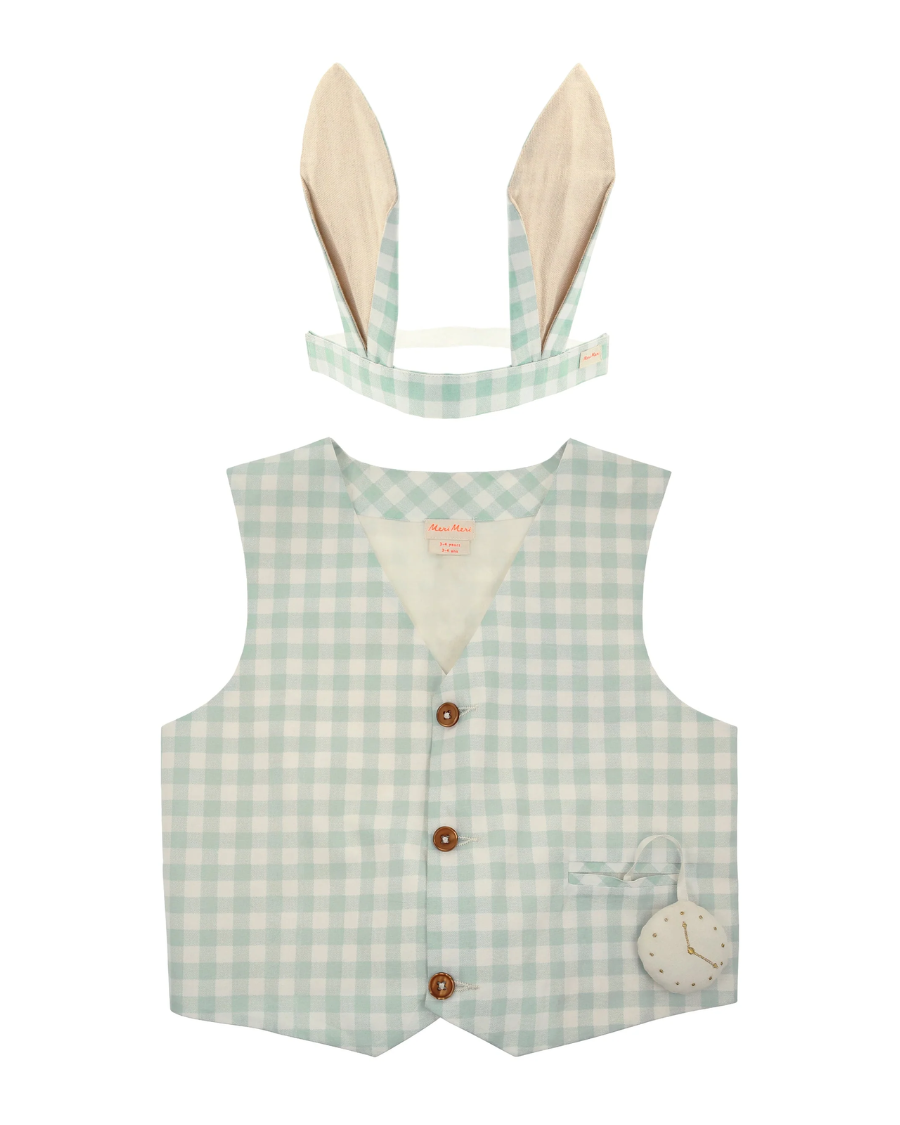 This fabulous bunny costume, beautifully crafted from blue gingham, is perfect for Easter parties and dressing up fun all year. Luxury details include a padded and embroidered fabric pocket watch and a fluffy pompom tail.