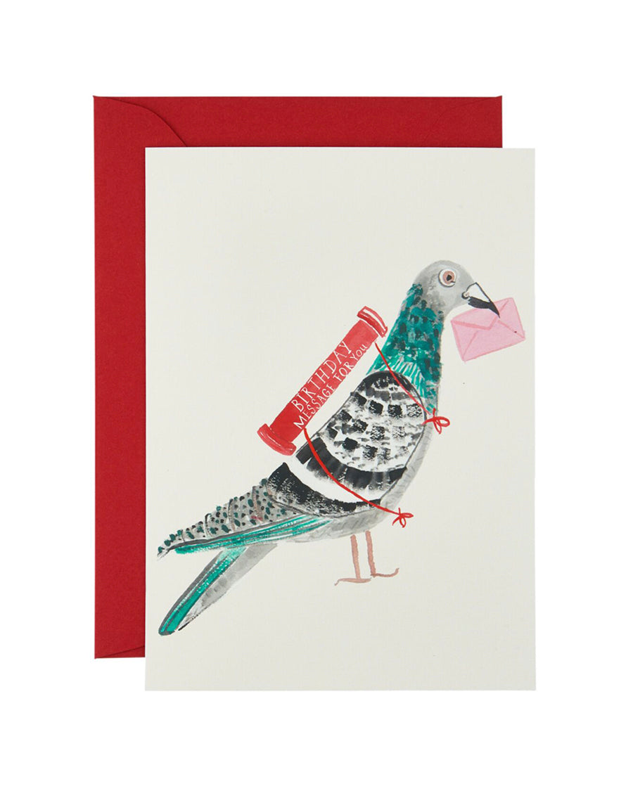 Birthday greetings from a New York city pigeon with a pink envelope and a red delivery tube tied round its proud iridescent breast. Pigeons, New York royalty! Made by Mr. Boddington.