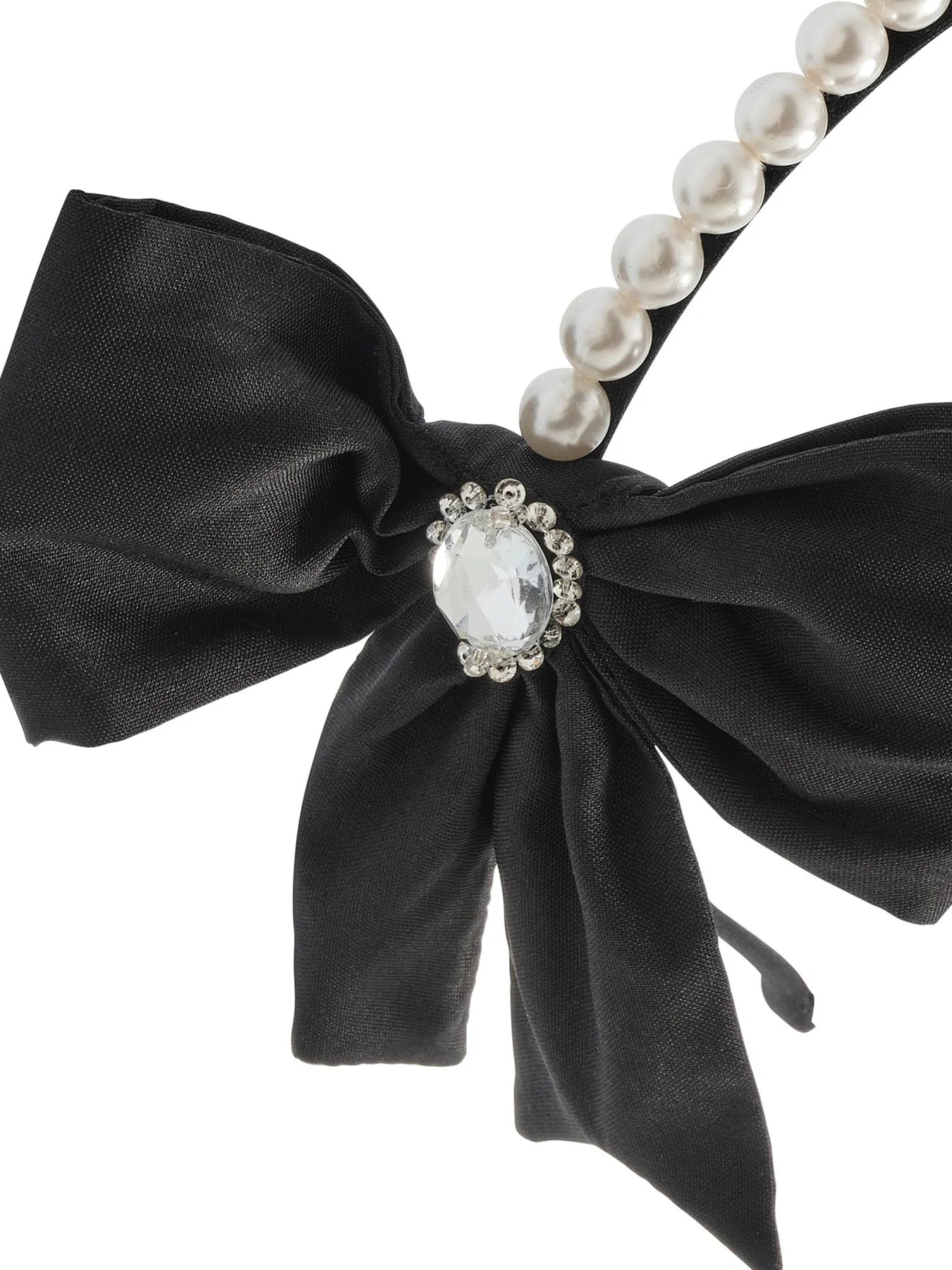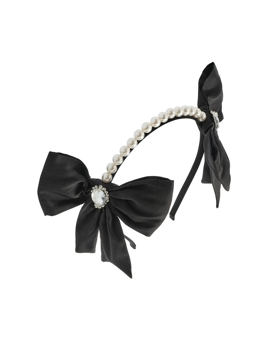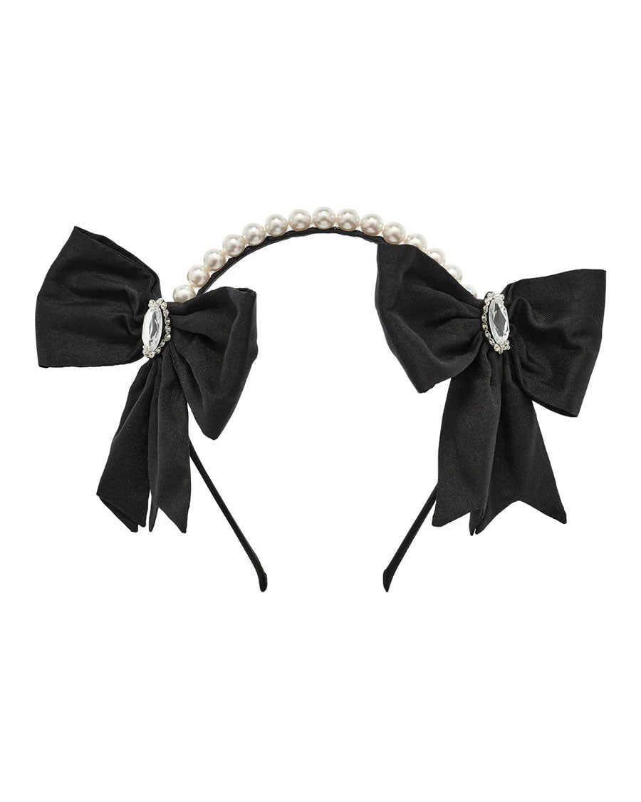 Make a statement with the Saloon Headband in Black. Featuring two large bows on either side, each adorned with a sparkling gem at the centre and surrounded by rhinestones. Pearls elegantly line the top of the headband, adding a touch of luxury and charm to any look.