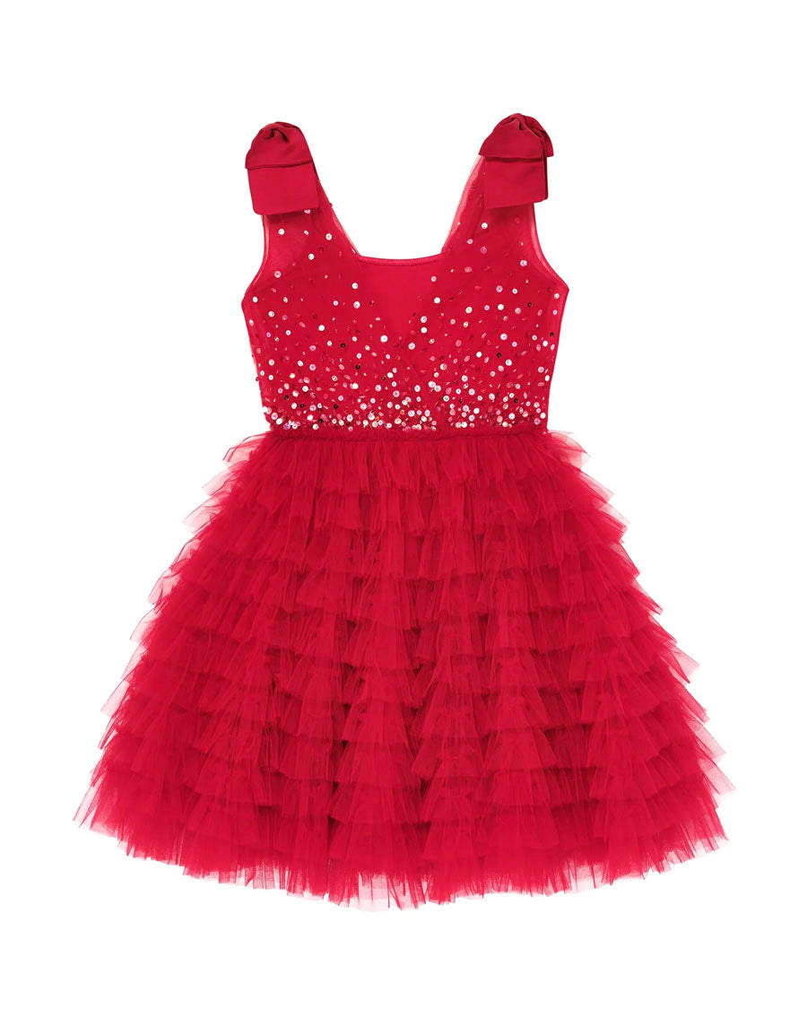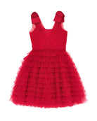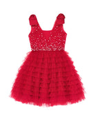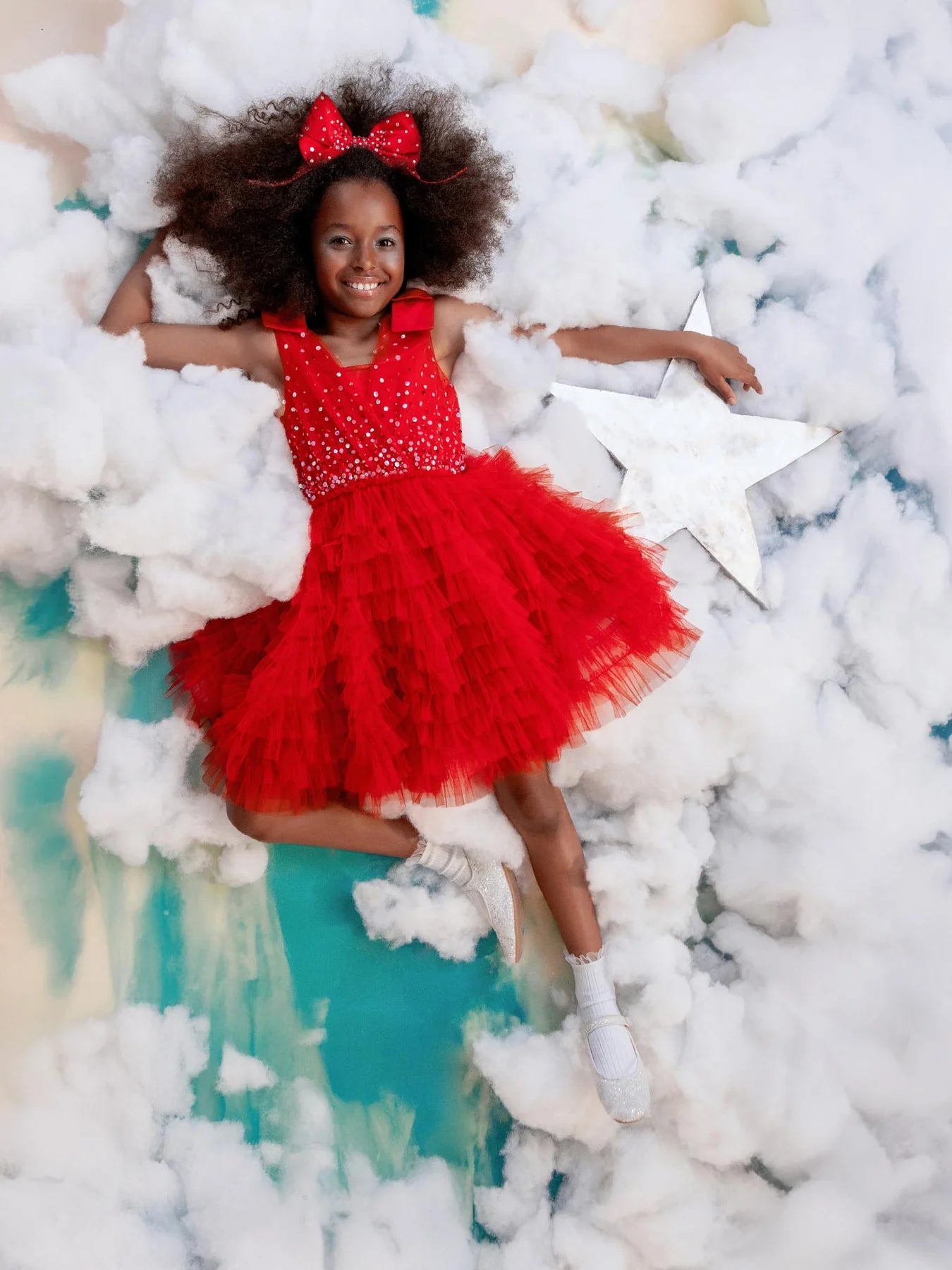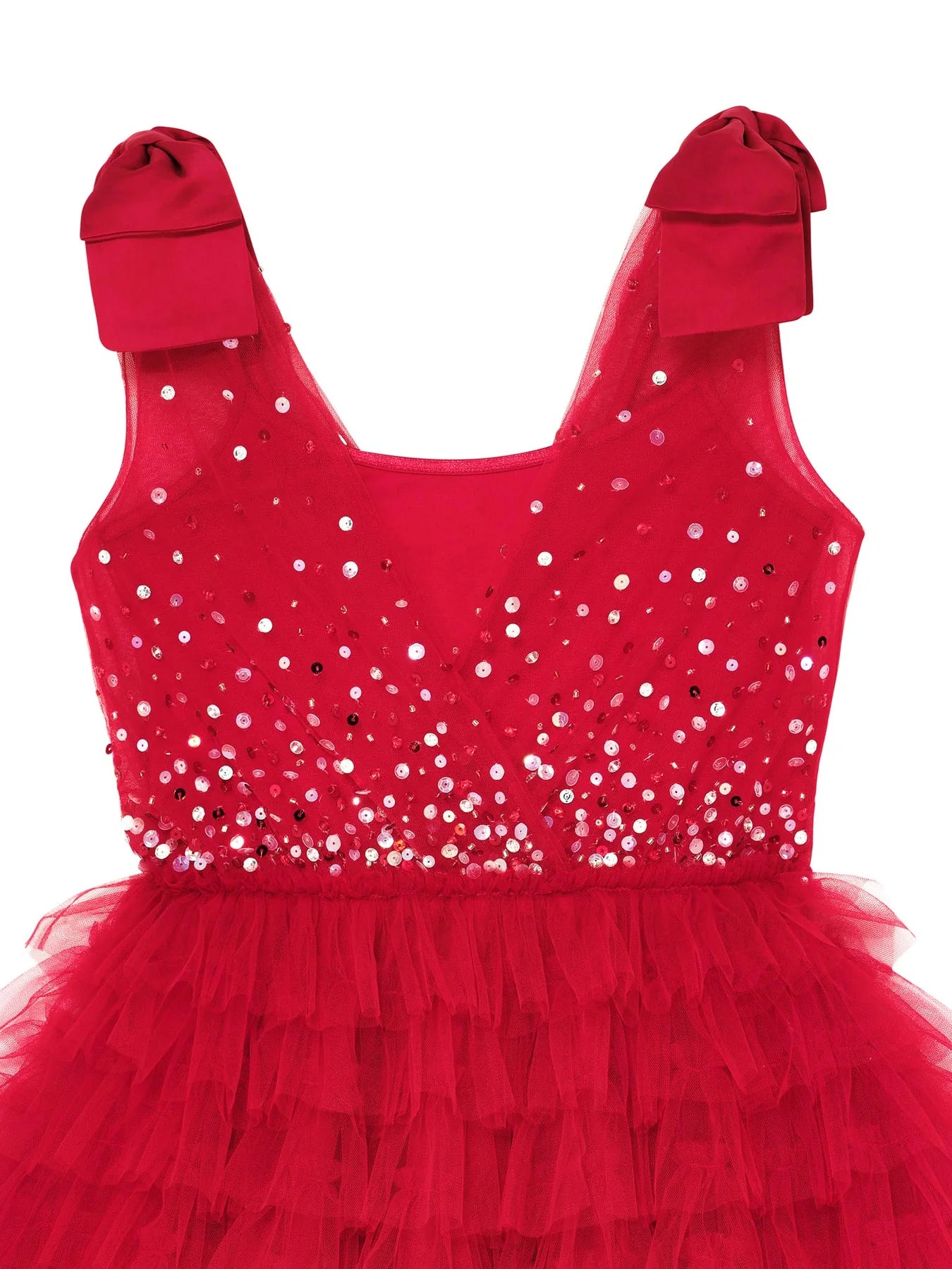She'll be a vision in Red Velvet whilst wearing the Euphoria Tutu Dress. Featuring a V shaped gathered tulle bodice studded with shimmering sequins. Cute satin bows sit delicately perched on each shoulder, adding a touch of charm and playfulness, while the multi-tiered skirt billows out into a luxurious, snowy silhouette.