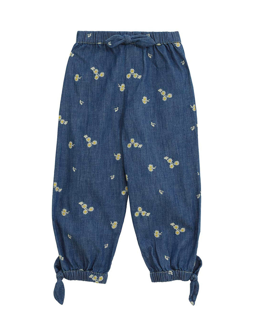 The Lucky Kids Denim Harem Pant in Daisy from our Summer Swim 2025 Collection. A kids cotton pant featuring an elasticated waistband with bow detailing at centre front and hems.