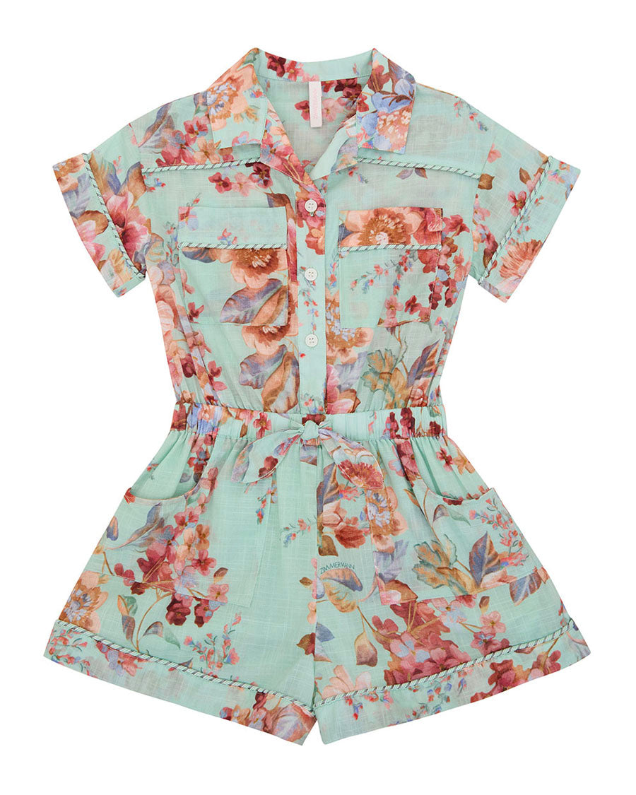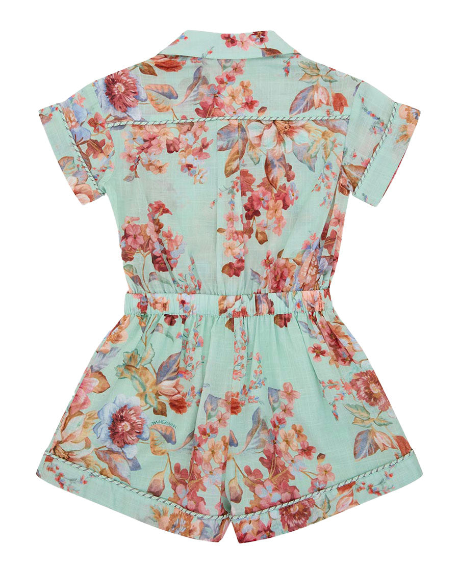 The Awaken Kids Pocket Playsuit in Mint Floral Multi from our Resort Swim 2026 Collection. A cotton kids playsuit featuring a classic collar, an elasticated waist and functional buttons.