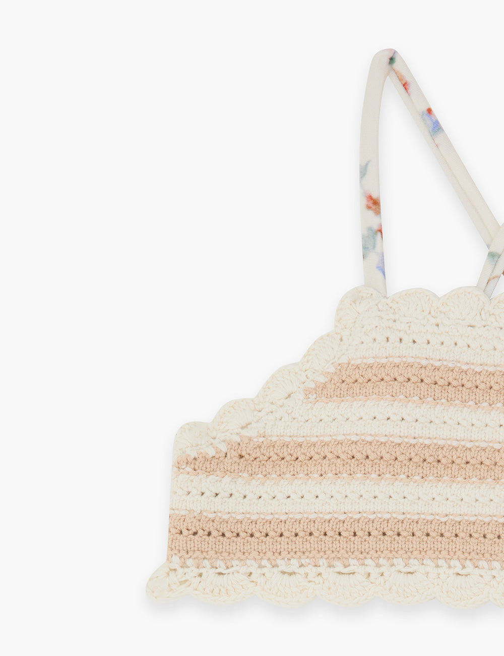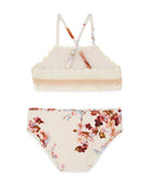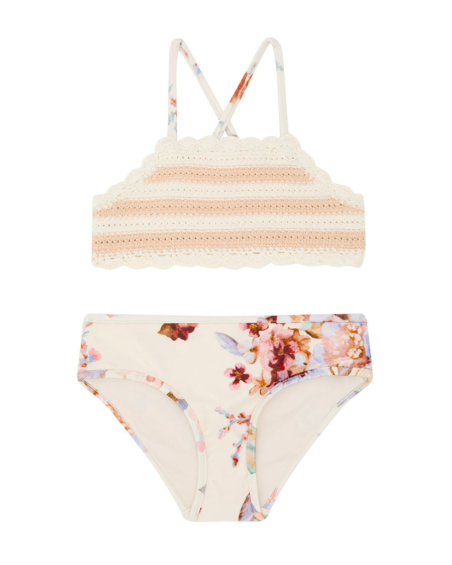 The Awaken Kids Knit Bikini in Ivory Floral Multi from our Resort Swim 2026 Collection. A kids bikini set featuring crochet detailing across top and scalloped edges.
