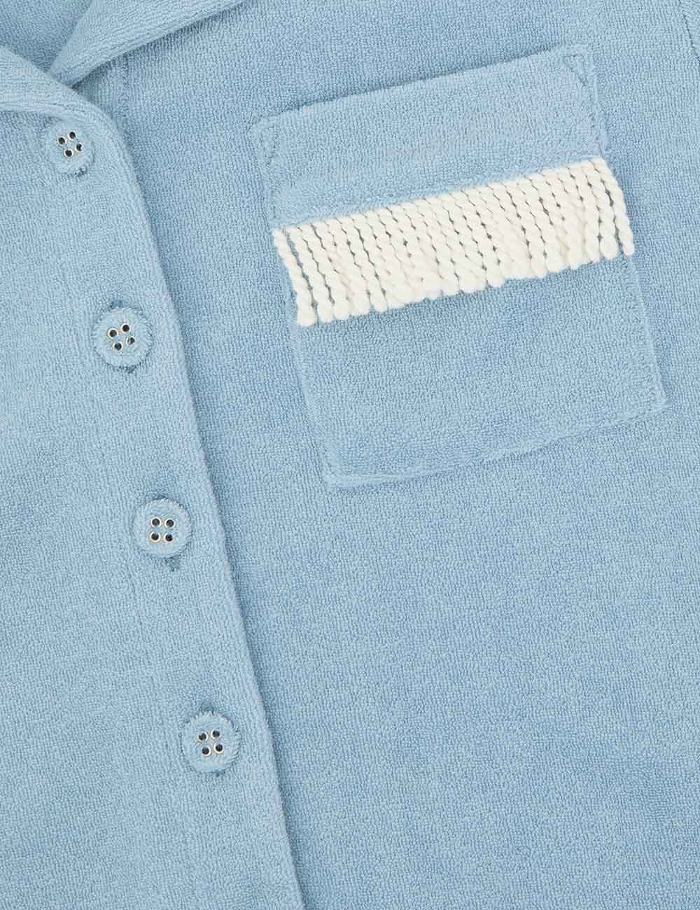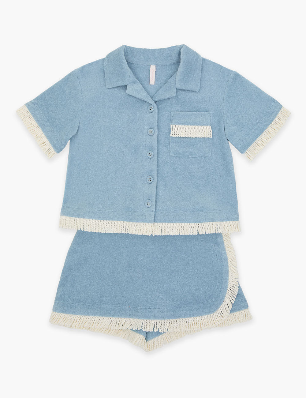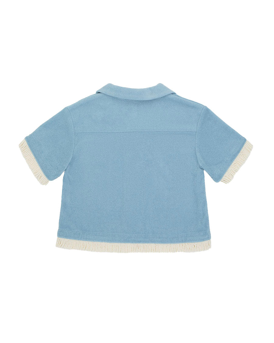 The Awaken Kids Terry Top in Light Blue from our Resort Swim 2026 Collection. A terry towelling kids top featuring a classic collar, centre front buttons and tassel fringe detailing.