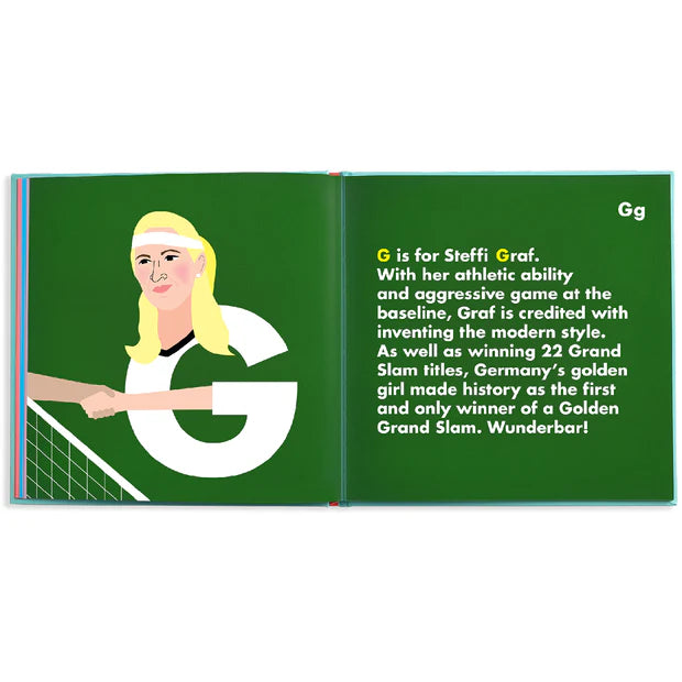 From Rod Laver to Roger Federer, Billie Jean King to Serena Williams, Tennis Legends Alphabet is a Grand Slam A to Z of the greatest men and women who have ever swung a racket. A stunningly illustrated lesson in history for any little legend that loves tennis.
