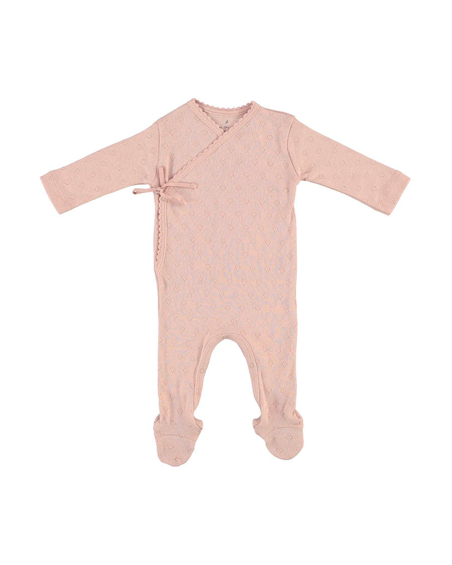 Bebe wrap overall in the softest organic cotton pointelle features a wrap opening, long sleeves, covered toes, and snaps for an easy change. This overall is the ultimate item for all babies and more especially for newborns. Match it with a Bebe Heart bonnet or Heart hat for a perfect set.