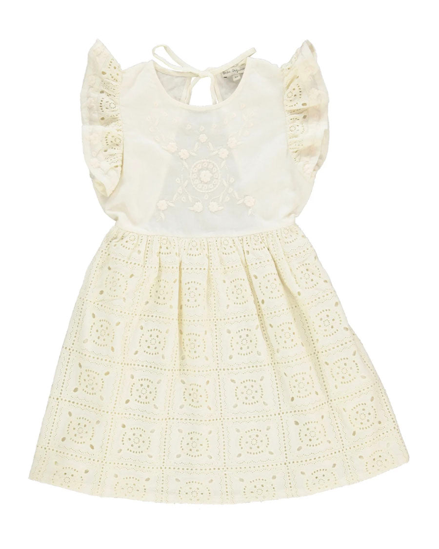 Our vintage dreams are made of this- adorable Amara dress is crafted from cotton and broderie fabric in natural white. Features beautiful floral embroidery, open back, ruffled butterfly sleeves and ties on the back with ribbon ties. As usual, a flouncy skirt- perfect for twirling.