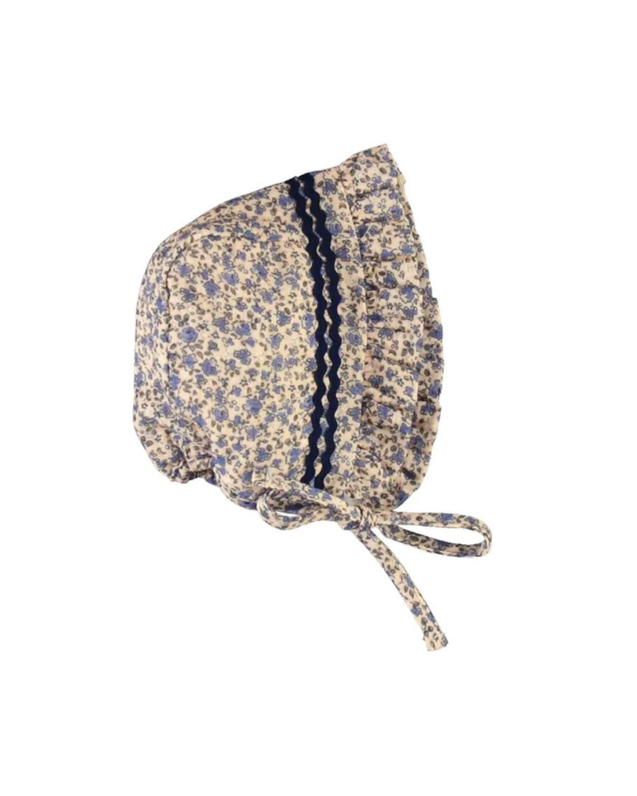 Inspired by vintage childhood memories, our beloved Carlotta bonnet is crafted from the softest organic cotton in sky blue floral print and trimmed with navy blue velvet tape. Adorable and comfortable bonnet with a gentle ruffle at front. Perfect match with Carlotta baby set.