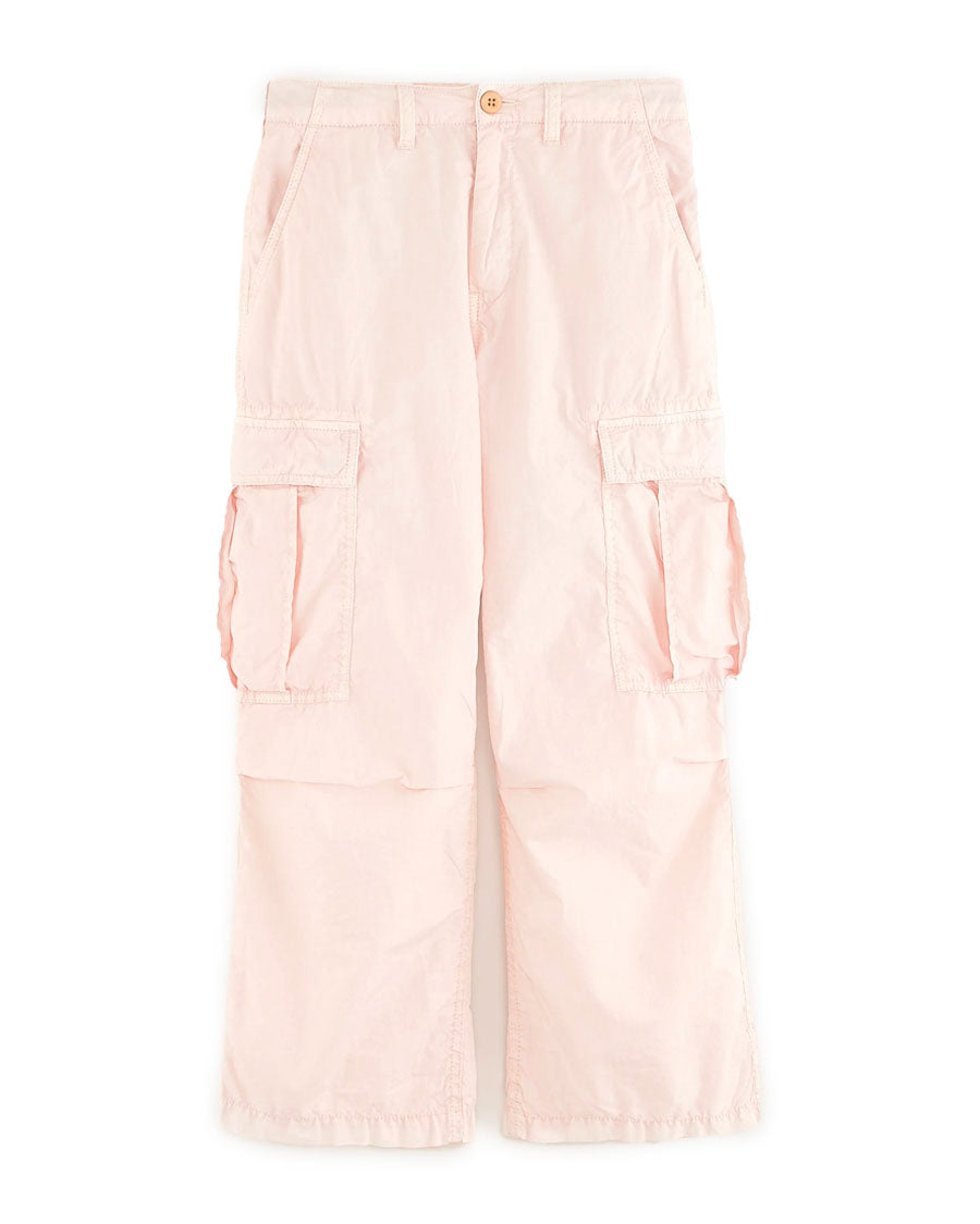 Mid-rise cargo pants with a baggy fit and wide legs, featuring large flap pockets on the sides. Crafted from light cotton canvas in blush pink.