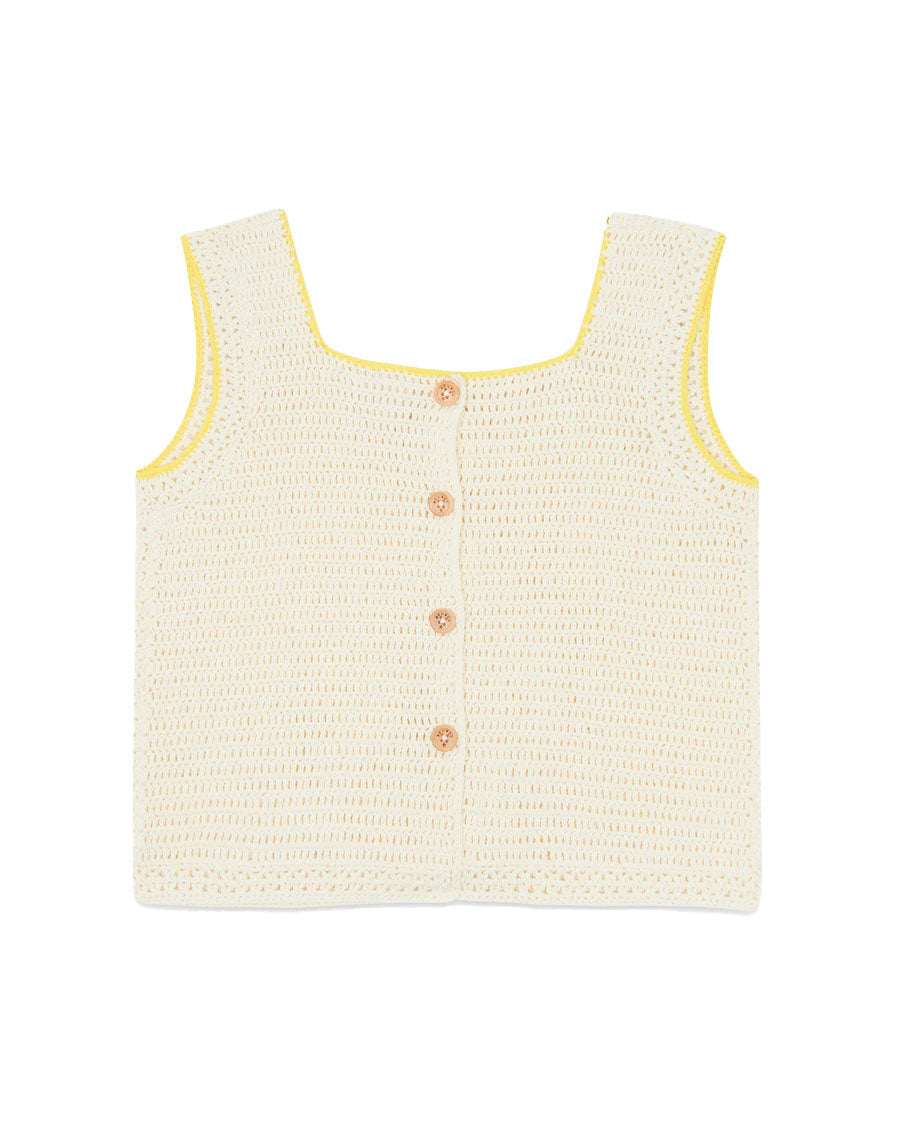 The Top Lanzarote in "Ecru Bonton "and its touches of Yellow "Lemon" comes from the "Dolce Vita" collection, a real celebration of vibrant colors and joie de vivre! Made of hook, it combines elegance and lightness. With its airy texture and its chic style, this top is ideal for adding a layer of comfort while remaining stylish.
