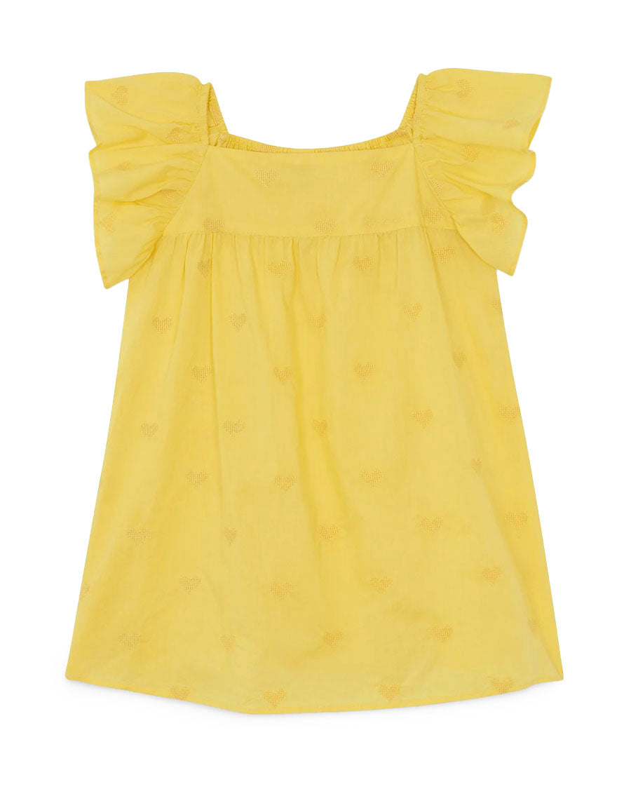 There Dress Dream of "lemon" color is a real ode to lightness. With its flared cut, its fleeting sleeves and its pretty pleated, it invites you to spin under the summer sun! Made in a veil Embroideredlittle hearts, this Dress Breathe freshness and style. A play from the "Dolce Vita" collection, a theme that celebrates vibrant colors and the Italian life joy!