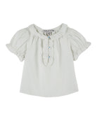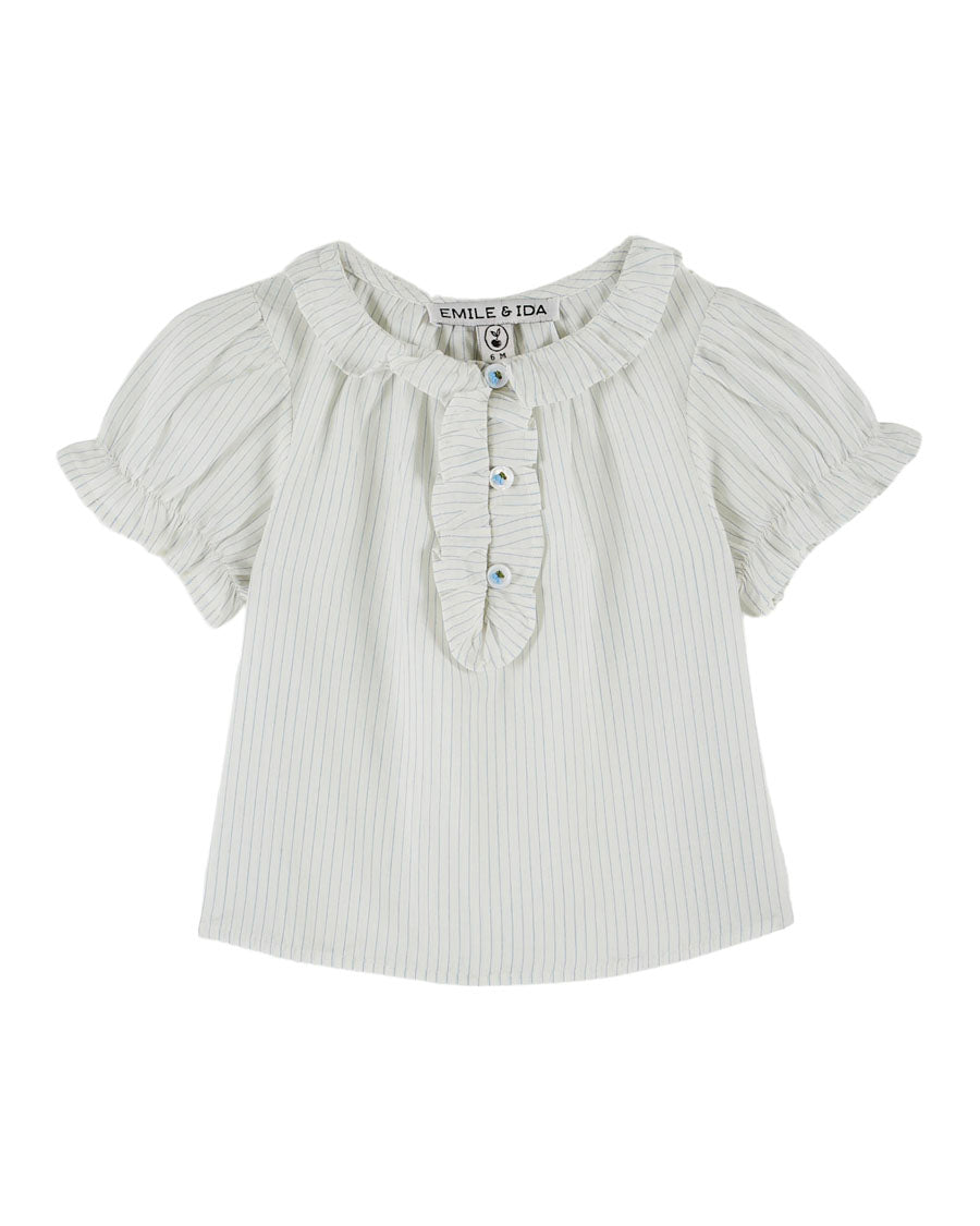 Blouse in white cotton striped with fine blue lines. Slightly flared cut, fully lined to counter the thinness of the cotton, and English seams that reinforce the joints so the blouse can be passed on to little sisters, cousins or friends. The round neckline is ruffled, as is the chest opening that closes with natural mother-of-pearl buttons slipped into elastic straps. The balloon sleeves are elasticated at the base to fit all arm sizes.