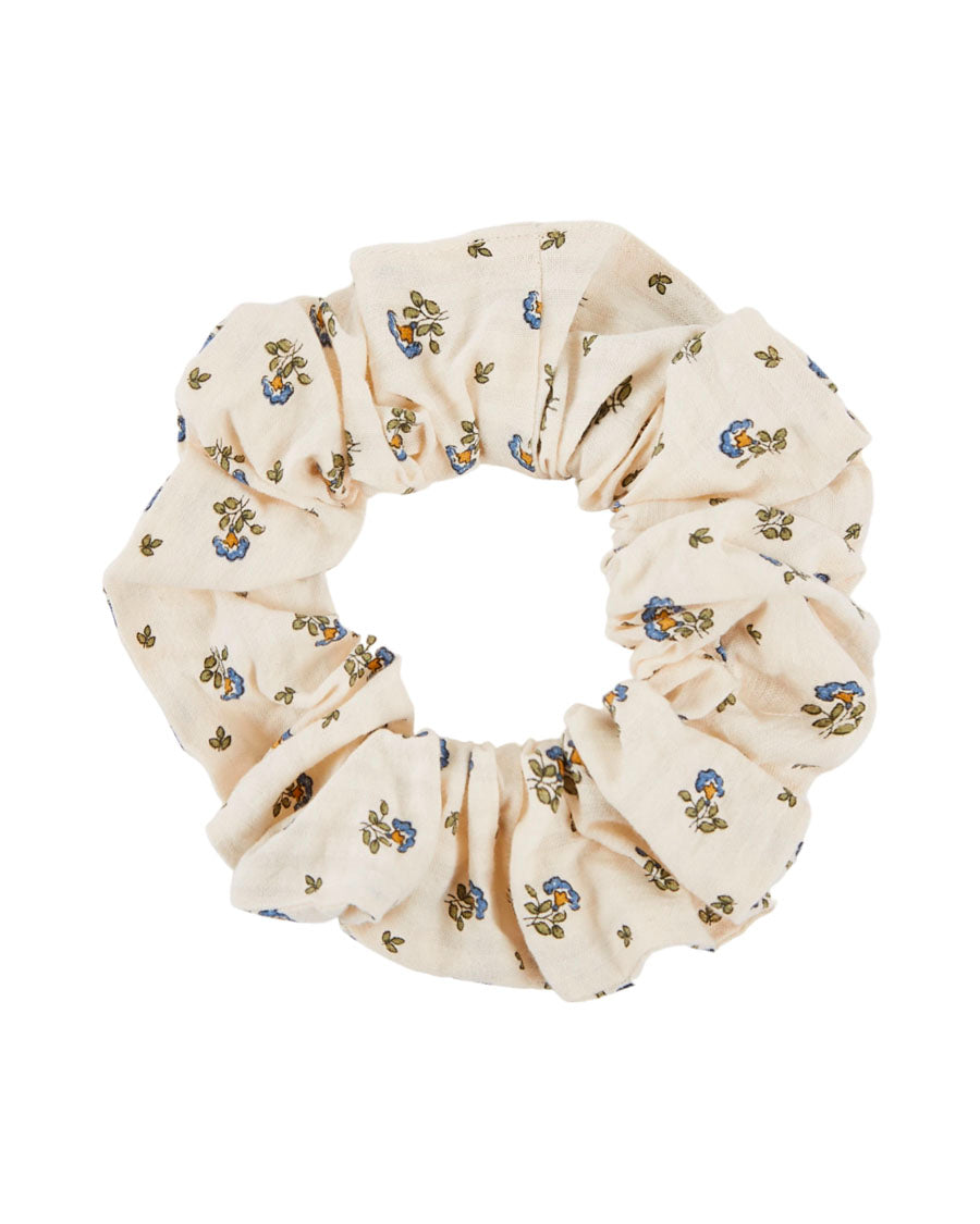 Ecru cotton scrunchy printed with blue flowers. Wear it in your hair or as a bracelet around your wrist, this scrunchie goes perfectly with the dress or blouse we offer in the same print.