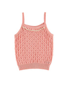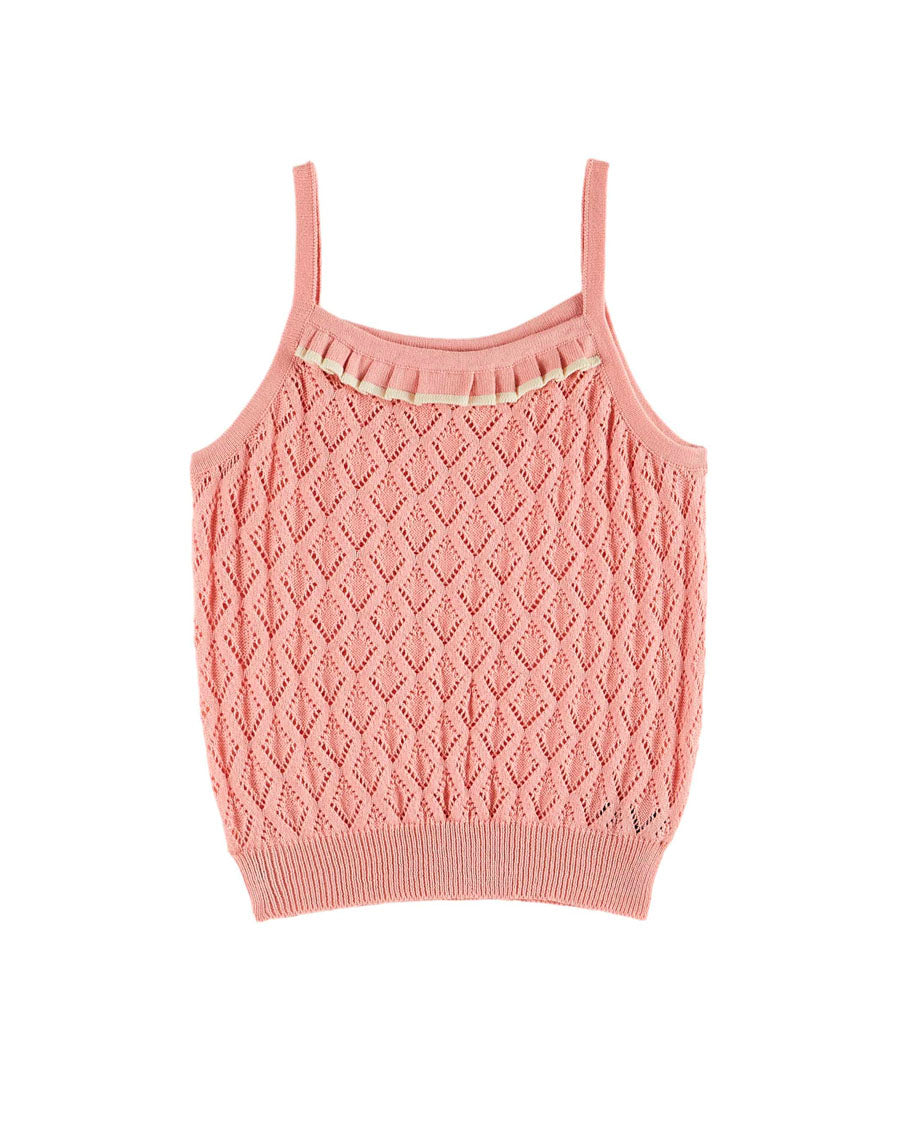 Pink cotton tank top knitted in fancy diamond-shaped stitches. The whole is very graphic and gives relief to the whole. It's also very soft and plush, thanks to the choice of material. A few rows of ribbing finish the neckline, highlighted by an ecru-trimmed frill on the front, and the edges extend to form the straps.
