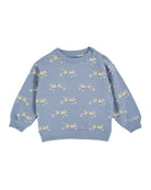 Lavender blue organic cotton fleece sweatshirt, printed with myopic white tigers. They run and jump all over the sweatshirt, from top to bottom, front to back, through the long sleeves. These tigers never leave the sweatshirt, either by jumping through the crew neckline, crossing the base, or even fleeing through the sleeves, finished, as with all sweatshirts, with tone-on-tone ribbing.
