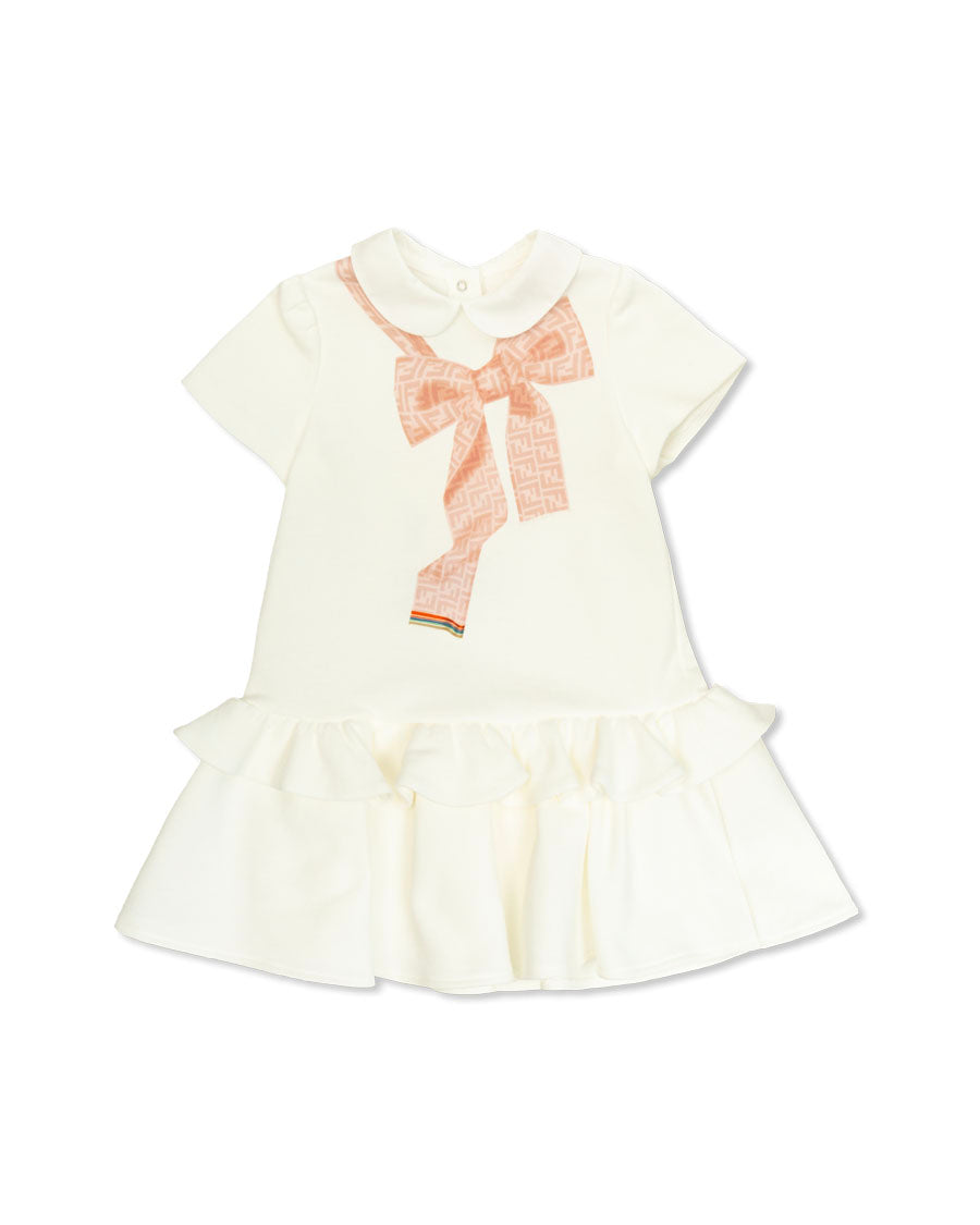 The dress is adorned with a distinctive bow print, embellished with a pink pattern and the iconic "F" emblem, a hallmark of the renowned Fendi brand. A subtle, colorful stripe at the bow's end enhances its unique appeal, while the voluminous ruffle hem adds an air of lightness and delicate allure.
