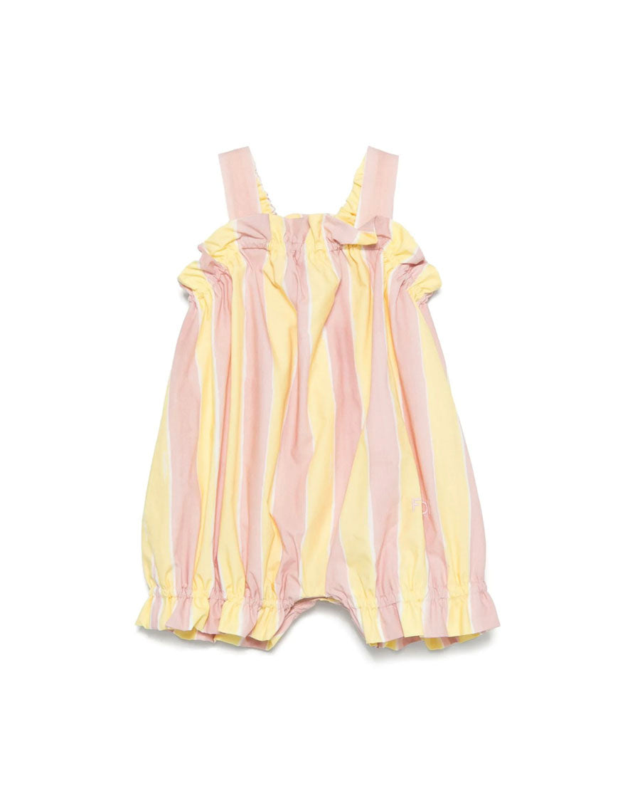 The product Fendi Kids pink baby girl overalls with yellow stripes and ruffles on the front made of 100% Cotton. The product features a pink/yellow color, striped print, embroidered logo, elasticized hem, ruffles on the front.