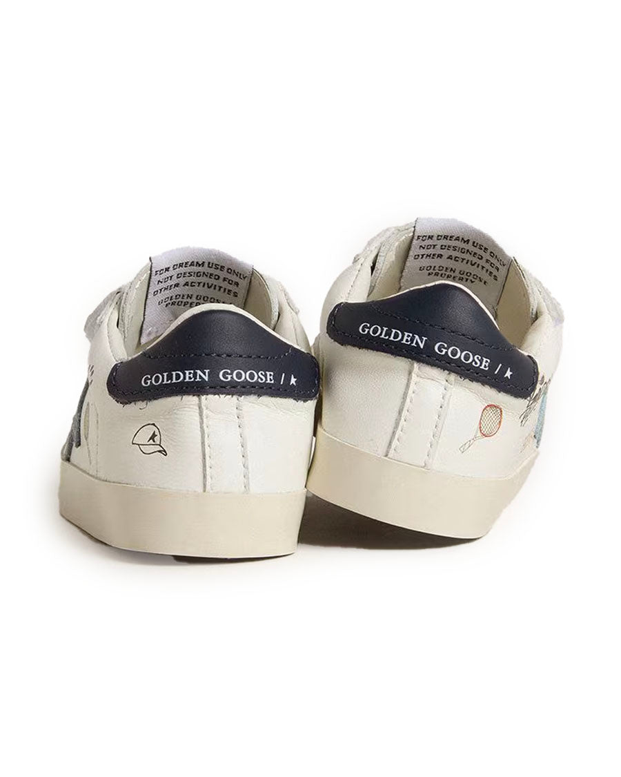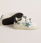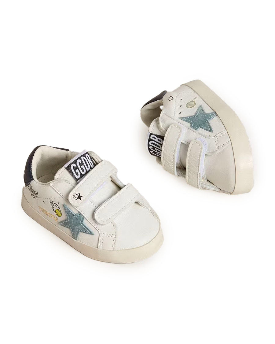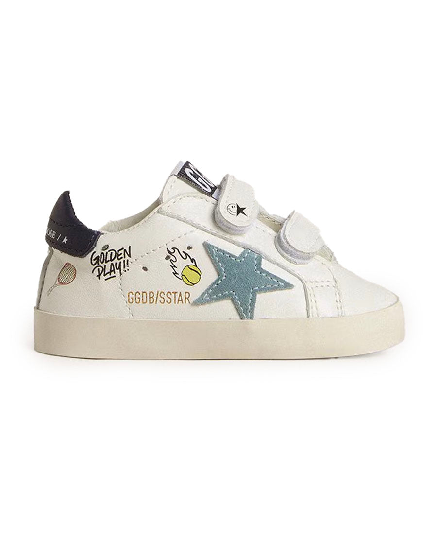 The Baby version of our Old School sneakers features two Velcro straps on the front. With a white nappa leather upper accented by a tennis motif and contrast lettering, this model features a light blue suede star and a light blue leather heel tab.