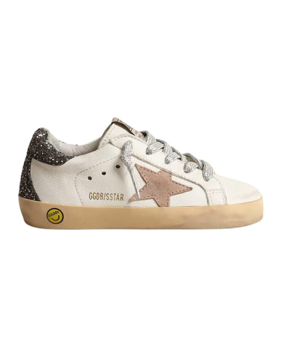 A timeless icon yet one that’s constantly evolving. At Golden, we love taking our classics and reworking them all the time, always from a new angle. The Junior version of these Super-Star with an optical-white nappa leather upper features a hazelnut suede star and dark gray glitter heel tab and insert on the back. The smiley detail on the foxing and the silver lurex laces add the finishing touch.