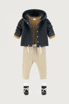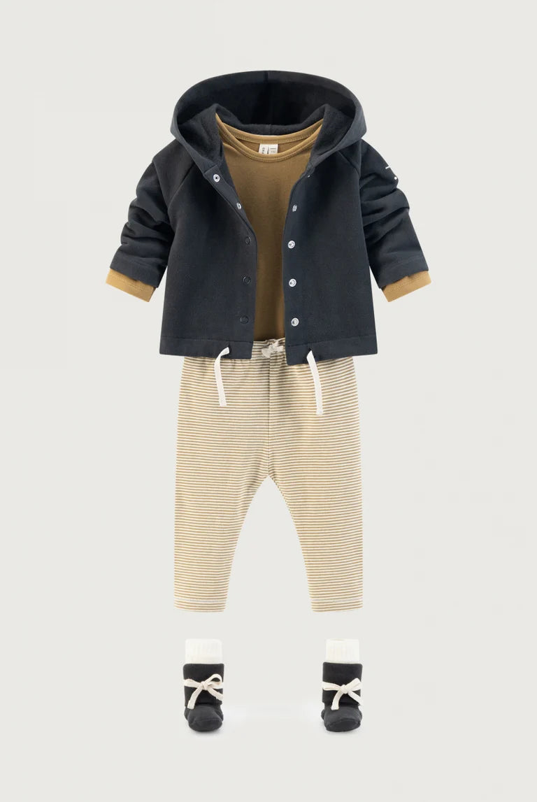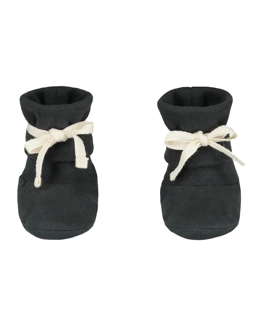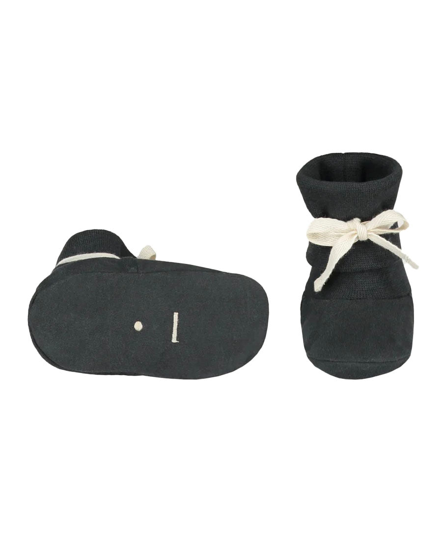 Baby booties in shape of a sock. They are made from our soft organic cotton and a little elastane fleece for a comfy fit. They have a rib knitted double layered folded cuff and a herringbone lace to tighten. Our logo is stitched on the sole of the right bootie