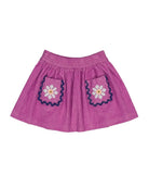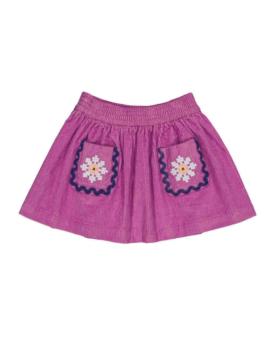 Voluminous short skirt corduroy with elasticated waist. Two front patch pockets edged with a contrasting applied ric rac and embroidered in the center.