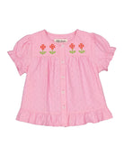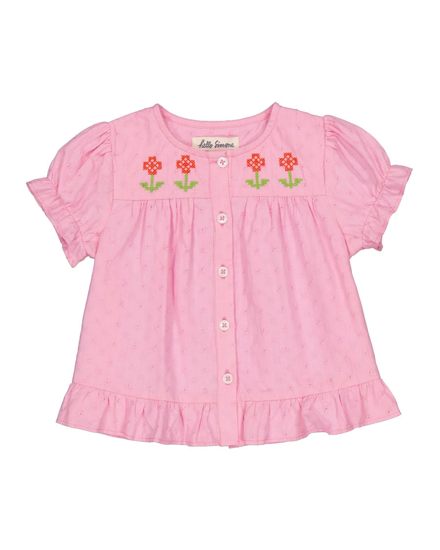 Baby cotton blouse with flat yoke, gathers bellow. Flower embroidery on front yoke and button front. Gathered shorts sleeves with smocks and ruffle.