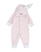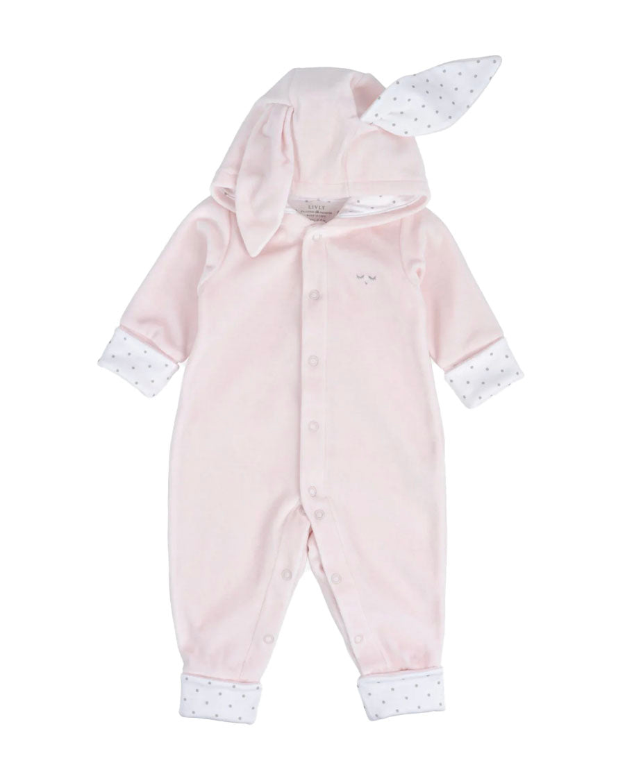 Plush bunny overall features a soft cotton blend that‚ cozy and comfy enough for all day wear. Featuring silver grey with silver Saturday dot design on sleeve and ankle cuffs, convenient snap closures down to the ankle and bunny ears hoodie for added cuteness! Makes a cute gift for baby showers and baby registries.