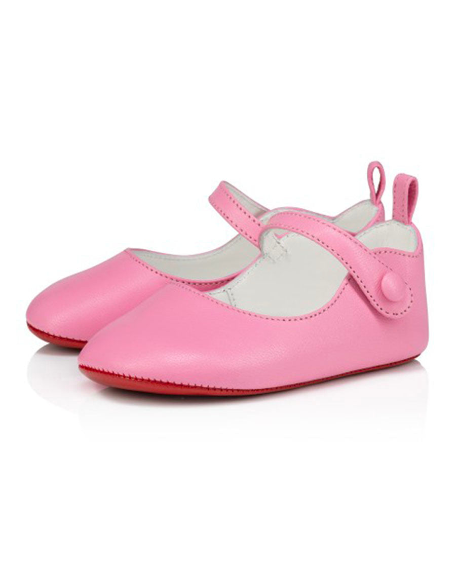 Cute in Calipso pink, the Baby Love Chick ballerina caresses tiny feet. A single leather strap crosses the foot and closes with a pink snap fastener, making this baby shoe easy to slip on and off. The leather back loop adds to the details while the iconic Maison Christian Louboutin Loubi red sole shows sophistication from an early age.