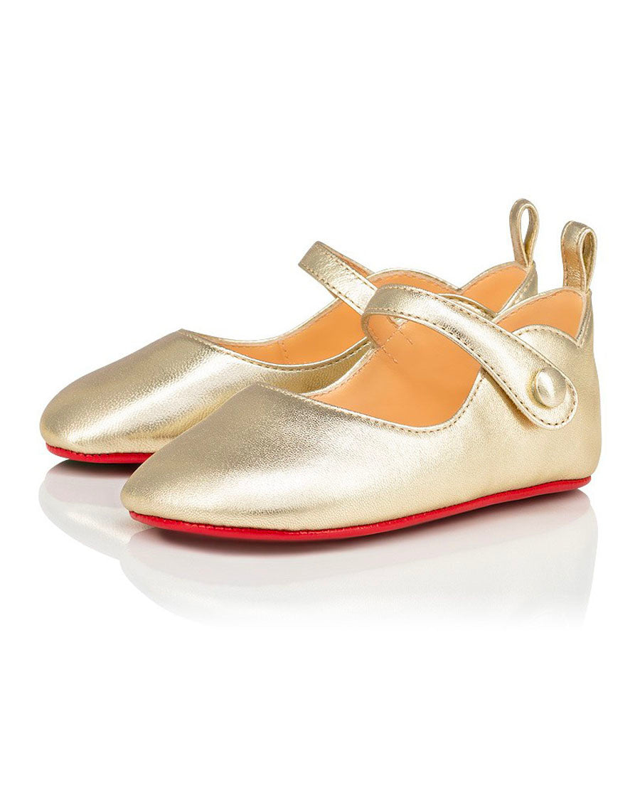 The charming Baby Love Chick ballerina pump has a timeless style and is crafted from a gold laminata nappa leather. Inspired by the iconic Hot Chick shoe, this Maison Christian Louboutin design has a heart-shaped scallop cut-out on the sides and visible topstitching. An elasticated strap on the side and heel tab heel make this shoe easy to slip on and off.