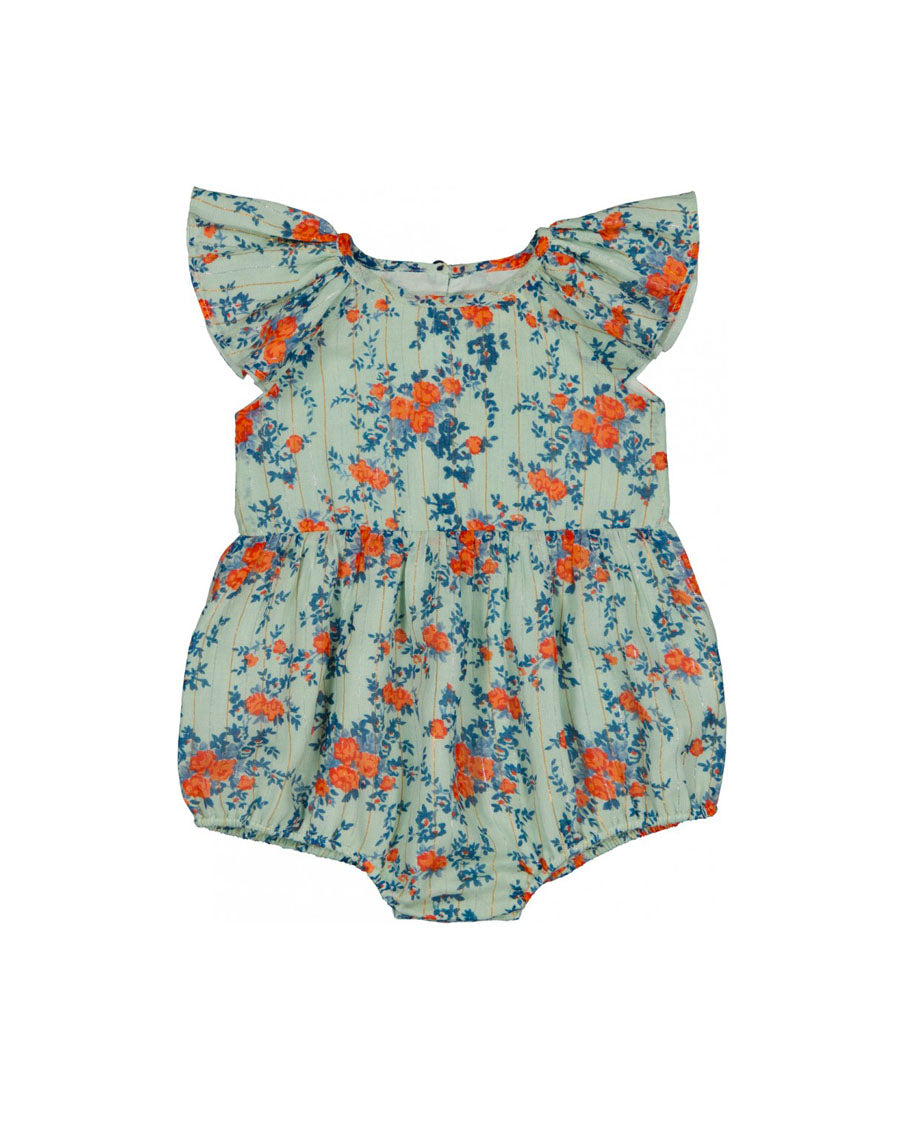 - Details: Bloomer jumpsuit, ruffled sleeves, closed back, press studs at crotch.