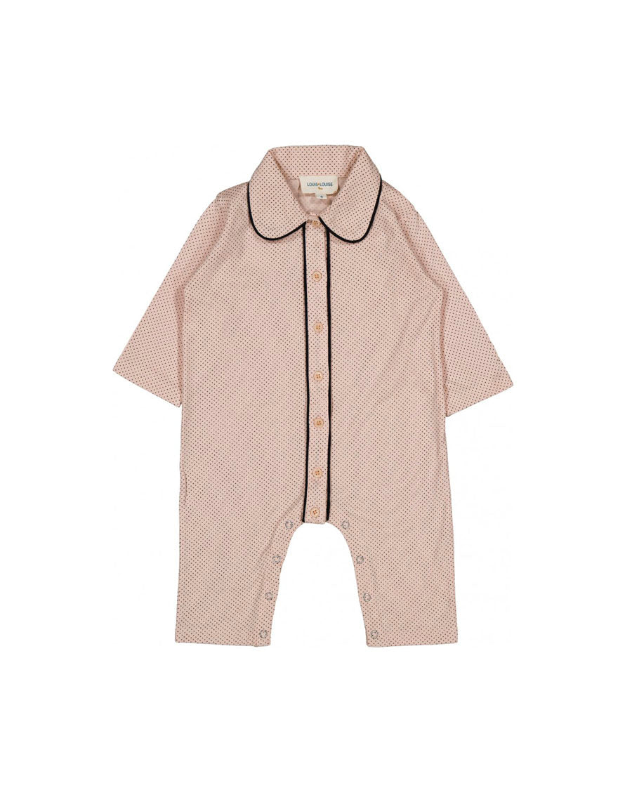 Details: Pyjama, long sleeves, buttoned at the front, snap buttons at the crotch.
