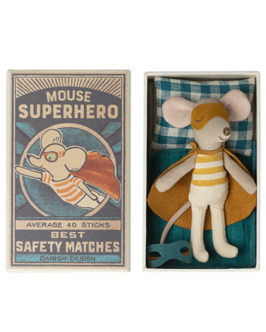 A classic Maileg item. This mouse is ready for hours of play and sleeps tight in a little matchbox. The clothes and bed linen come in unique prints and beautiful colors. Two face masks included - one for flying and one for sleeping.